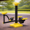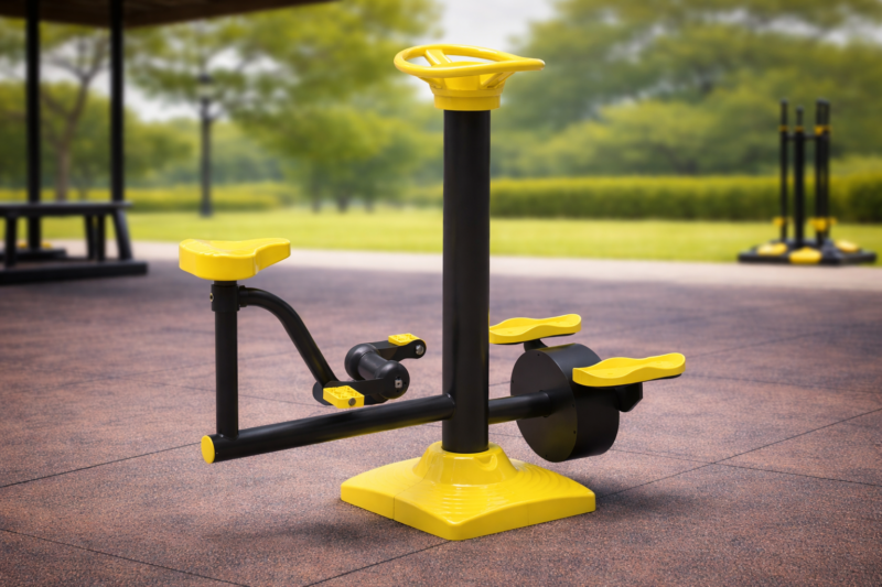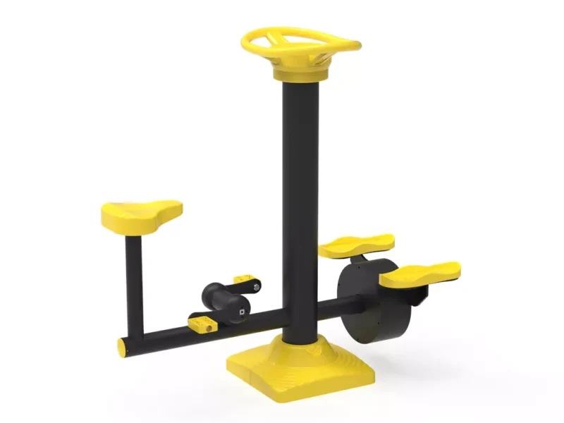 Diseño Ergonómico Seguro: Los asientos y pedales están fabricados con materiales técnicos que evitan deslizamientos, cumpliendo estrictamente con las normativas de seguridad para equipamiento de parques biosaludables.
