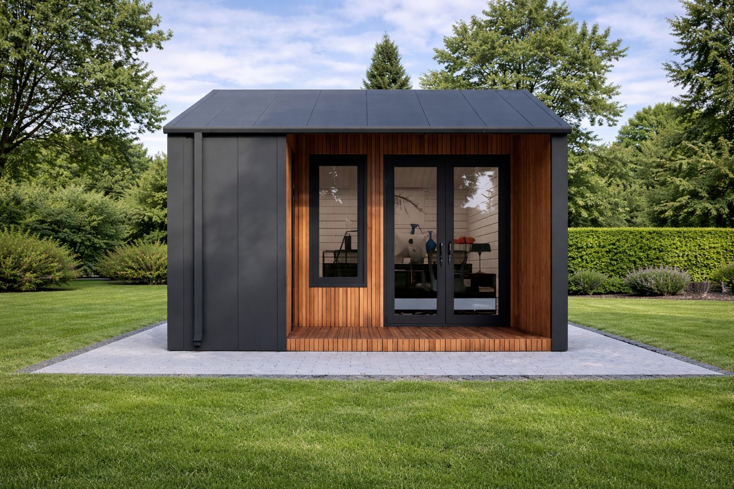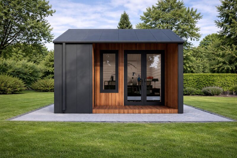 Arquitectura residencial en formato compacto. La Cabaña Híbrida ARIA representa la cumbre de la serie híbrida, ofreciendo un espacio diáfano de hasta 25 m² con un rendimiento térmico de vivienda pasiva. Con un impresionante muro técnico de 189 mm y un aislamiento de 100 mm que envuelve suelos, techos y paredes, la ARIA garantiza un confort climático total sin importar la estación. Su diseño exterior combina el blindaje industrial del acero «Clásico Clic» con la nobleza del pino termotratado, eliminando el mantenimiento y aportando una estética de lujo contemporáneo. Equipada con la ingeniería alemana de Schüco uPVC, es la solución definitiva para un apartamento de invitados, un estudio de yoga o una oficina corporativa de alta gama.
