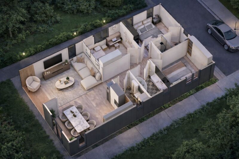 El modelo Tipo A de 87,5 m² ha sido proyectado para quienes necesitan el espacio de una vivienda tradicional con las ventajas tecnológicas de la construcción híbrida. Su planta rectangular de 12,5 metros de largo permite una distribución interior fluida, separando magistralmente las zonas de descanso del área social, todo bajo un estándar de confort térmico insuperable.