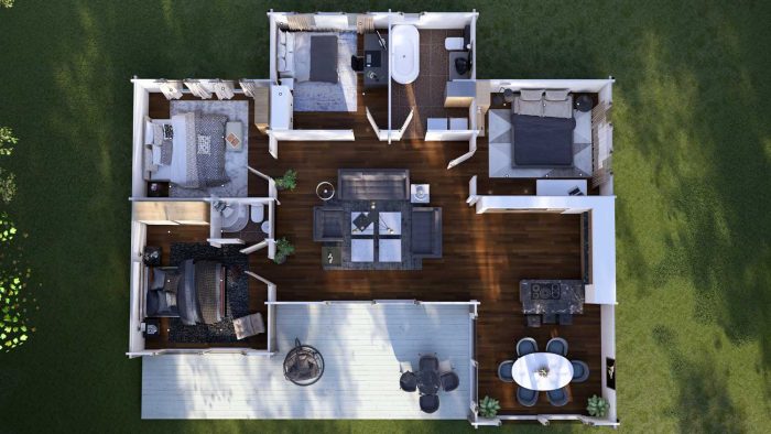 La Cabaña de Madera de 14,2 m × 12,2 m es la joya de la corona de nuestra serie residencial. Su diseño ha sido proyectado para maximizar la entrada de luz natural y ofrecer una distribución fluida que compite con la construcción tradicional, pero con las ventajas térmicas y la rapidez de ejecución de la madera escandinava de alta densidad.