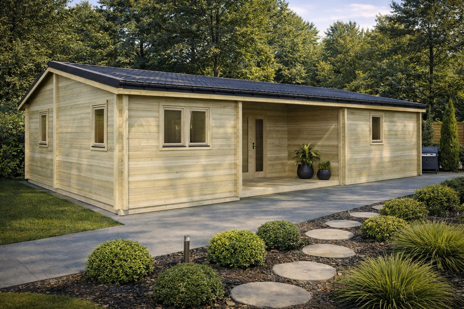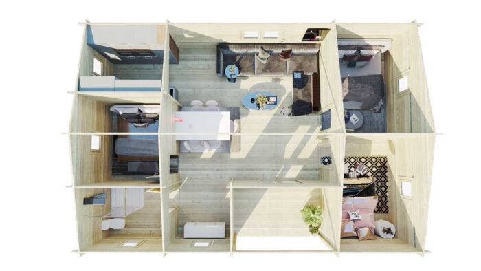 La Cabaña de Madera de 10,2 m × 7,0 m es la prueba de que se puede tener una vivienda familiar completa con estándares escandinavos sin una inversión prohibitiva. Su diseño aprovecha cada centímetro para ofrecer tres habitaciones independientes, convirtiéndola en una de las opciones más demandadas por familias jóvenes y propietarios que buscan rentabilizar su parcela.