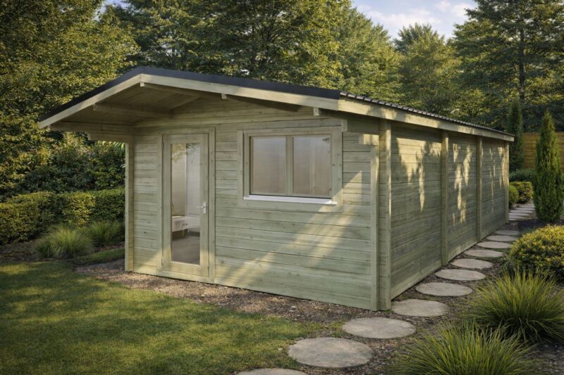 Distribución inteligente en formato rectangular. La Cabaña de Madera Tipo C (4,0 m × 7,0 m) es la solución de 1 dormitorio más equilibrada para quienes buscan una vivienda compacta que se sienta como un hogar completo. Gracias a su planta alargada de 28 m2, este modelo permite una separación clara entre el salón y el dormitorio, maximizando la privacidad. Fabricada con tronco macizo escandinavo, incluye de serie un paquete de extras valorado en 2.510 €, que comprende tejas de acero, aislamiento de suelo de 100 mm y carpintería premium tipo vivienda. Es la inversión perfecta para una «Granny Flat», un estudio de invitados de alta gama o una unidad de alquiler vacacional con 10 años de garantía.