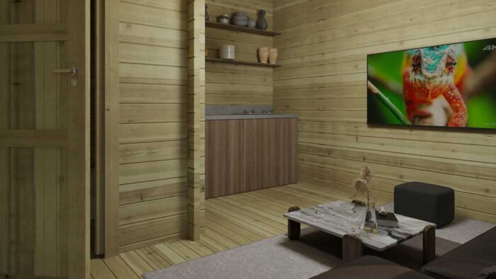 Salón y Cocina «Open Plan»: El corazón de la cabaña, que gracias a sus 2,34 m de altura de pared, ofrece un volumen interior que elimina cualquier sensación de agobio.