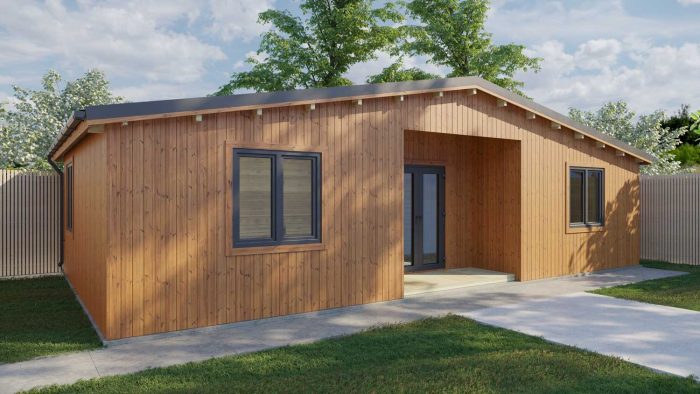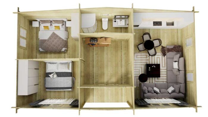 Uso Recomendado: La Cabaña Tipo E es la favorita para «Granny Flats» (apartamentos de jardín para familiares) o como vivienda de retiro, gracias a que toda su distribución se encuentra en una sola planta cómoda y accesible.