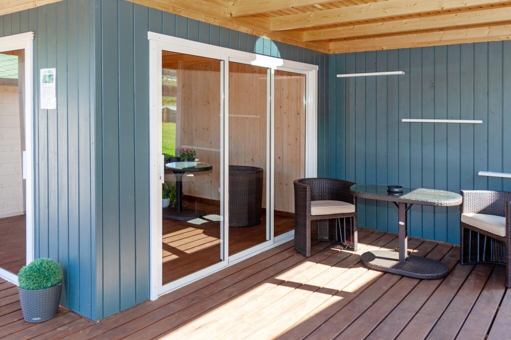 Sugerencia de Decoración: Al ser una madera sin tratar, la Caseta CARIBE luce espectacular con lasures en tonos gris ceniza o ébano, que resaltan la perfilería de las puertas y refuerzan su carácter de «loft» de jardín contemporáneo.