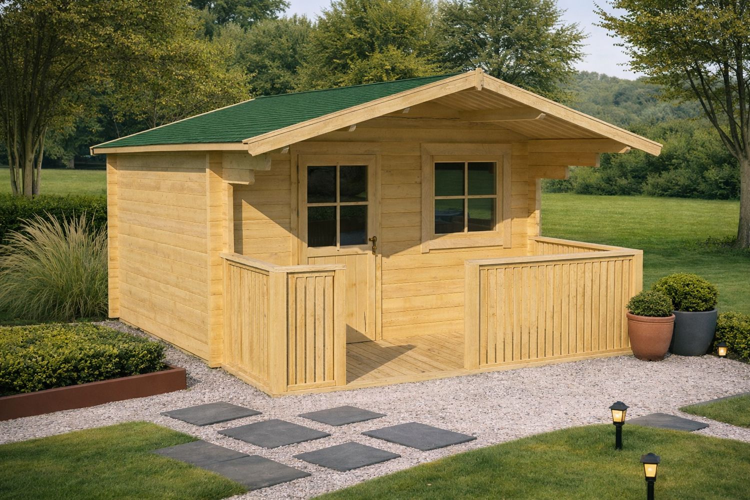 El secreto de su firmeza reside en el sistema de troncos macizos de abeto nórdico con doble lengüeta y ranura. Sus esquinas están entrelazadas y fresadas en los cuatro lados con precisión milimétrica, lo que garantiza una construcción estanca, resistente a las fuertes rachas de viento y totalmente estable frente a las dilataciones naturales de la madera.