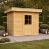 La Caseta de Madera Bruma Natural destaca por su silueta limpia y su geometría perfecta. Con una superficie de 5 m², este modelo ha sido proyectado para integrarse en espacios exteriores donde el diseño es tan importante como la utilidad, ofreciendo un volumen de almacenamiento eficiente para bicicletas, herramientas de jardín o equipos de piscina.