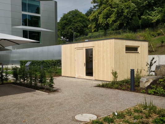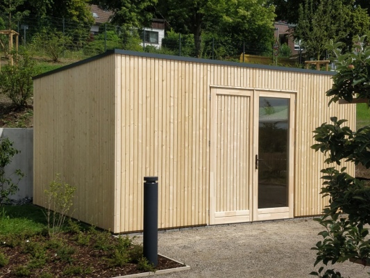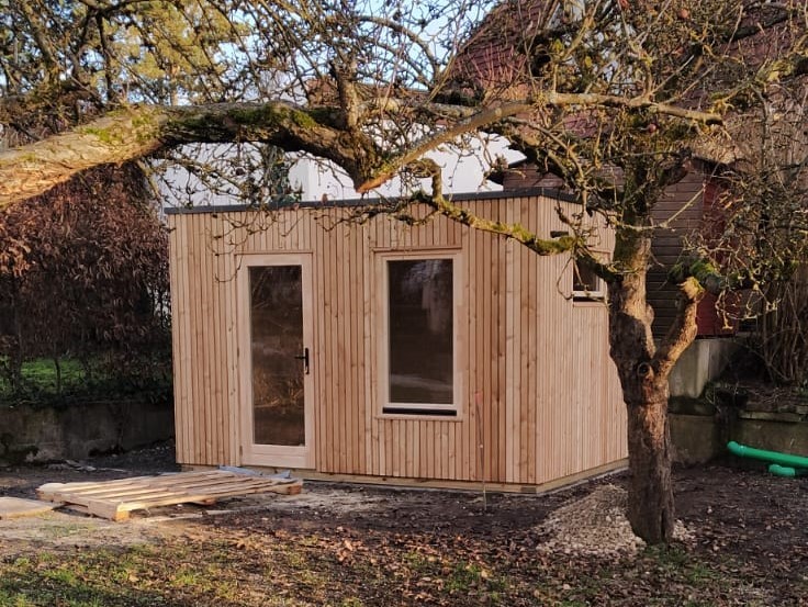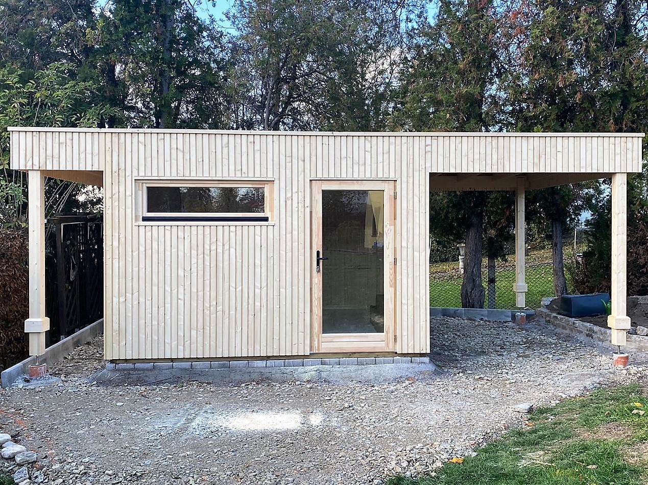 El tejado está fabricado con revestimiento machihembrado de 20 mm sobre vigas cepilladas y encoladas de alta resistencia. Su baja inclinación lo hace ideal para la instalación de cubiertas modernas tipo EPDM, asegurando una estanqueidad total y una integración fluida en jardines de estilo contemporáneo.