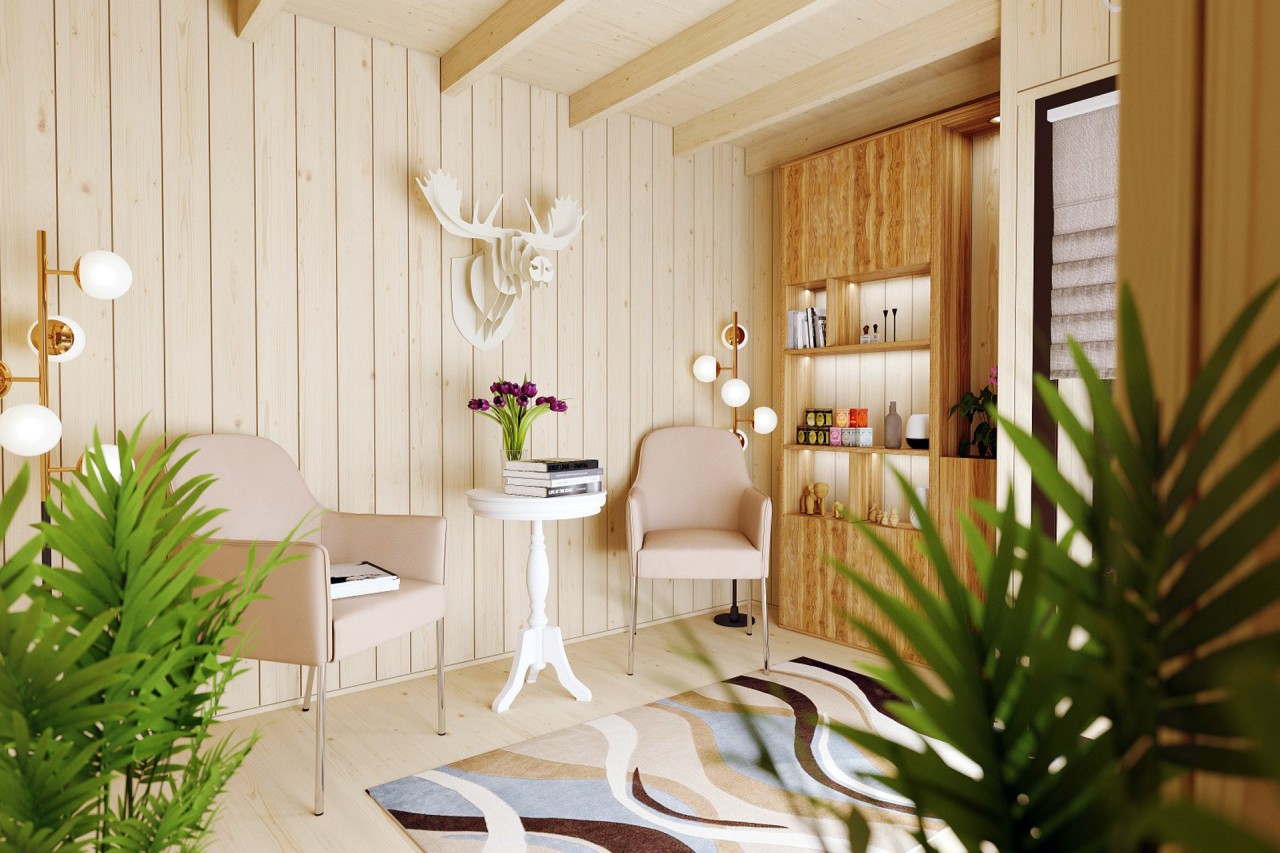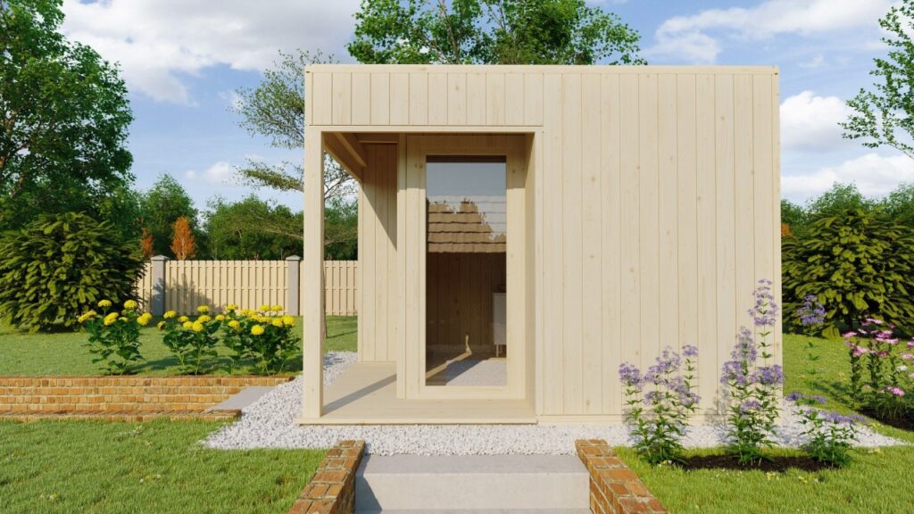 Porche de Transición: Incluye una terraza de 30 mm sobre bastidor impregnado, proporcionando una plataforma elegante que protege la entrada y sirve como zona decorativa o pequeño espacio de descanso exterior.