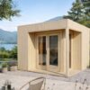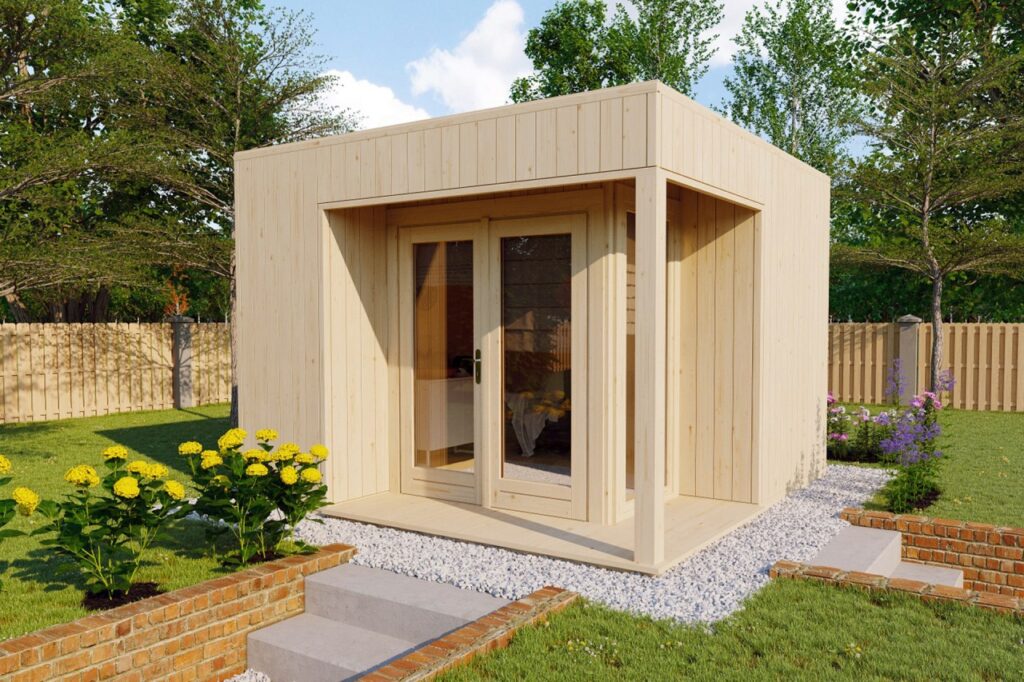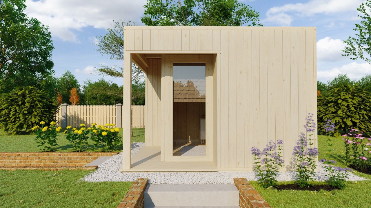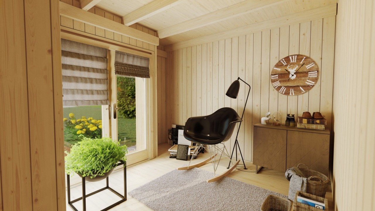 Equipado con tableros machihembrados de 20 mm en suelo y techo sobre vigas reforzadas. El techo plano está preparado para sistemas de impermeabilización modernos como membrana EPDM.