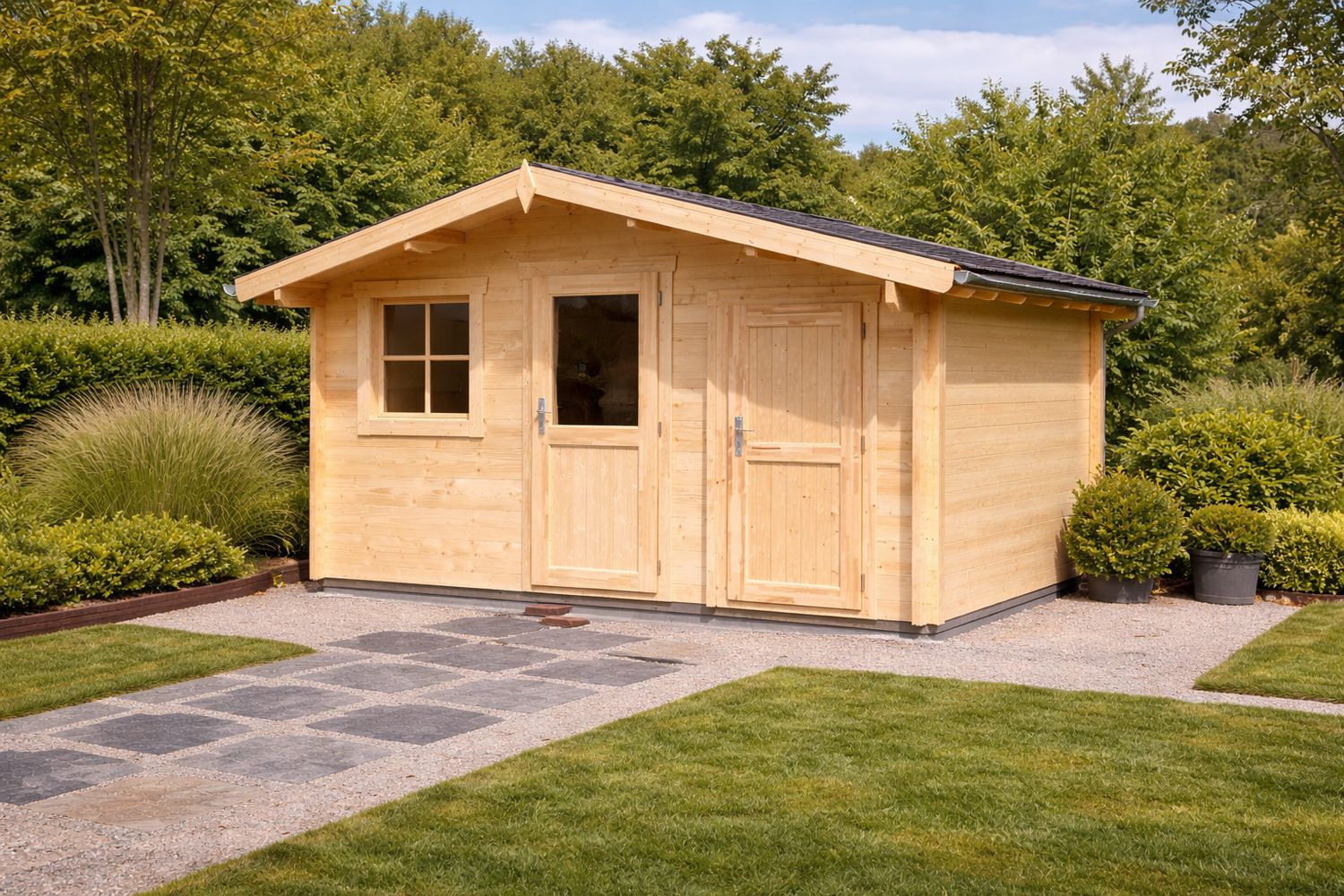 Tejado a Dos Aguas de 16°: Un diseño atemporal que garantiza un drenaje óptimo del agua. Fabricado con tablas machihembradas de 20 mm sobre correas de techo reforzadas.