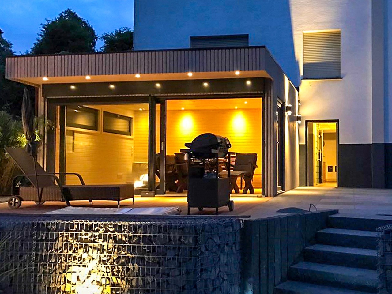 Corredera Elevable Panorámica (450 × 210 cm): Un frente de cristal casi total en acabado antracita que permite fusionar el interior con el jardín, ideal para oficinas de lujo o salones de ocio.