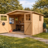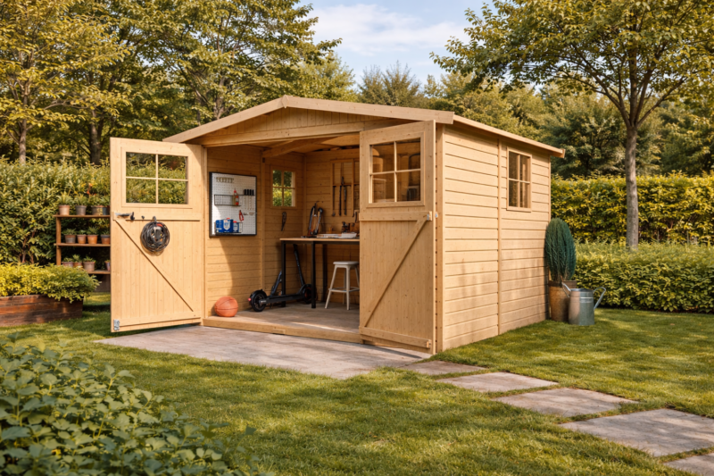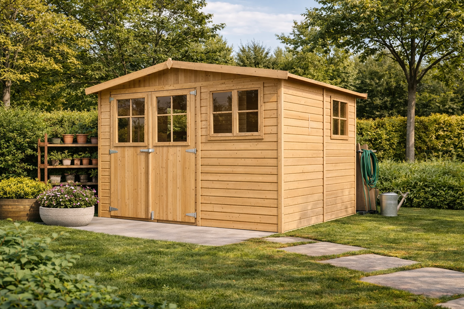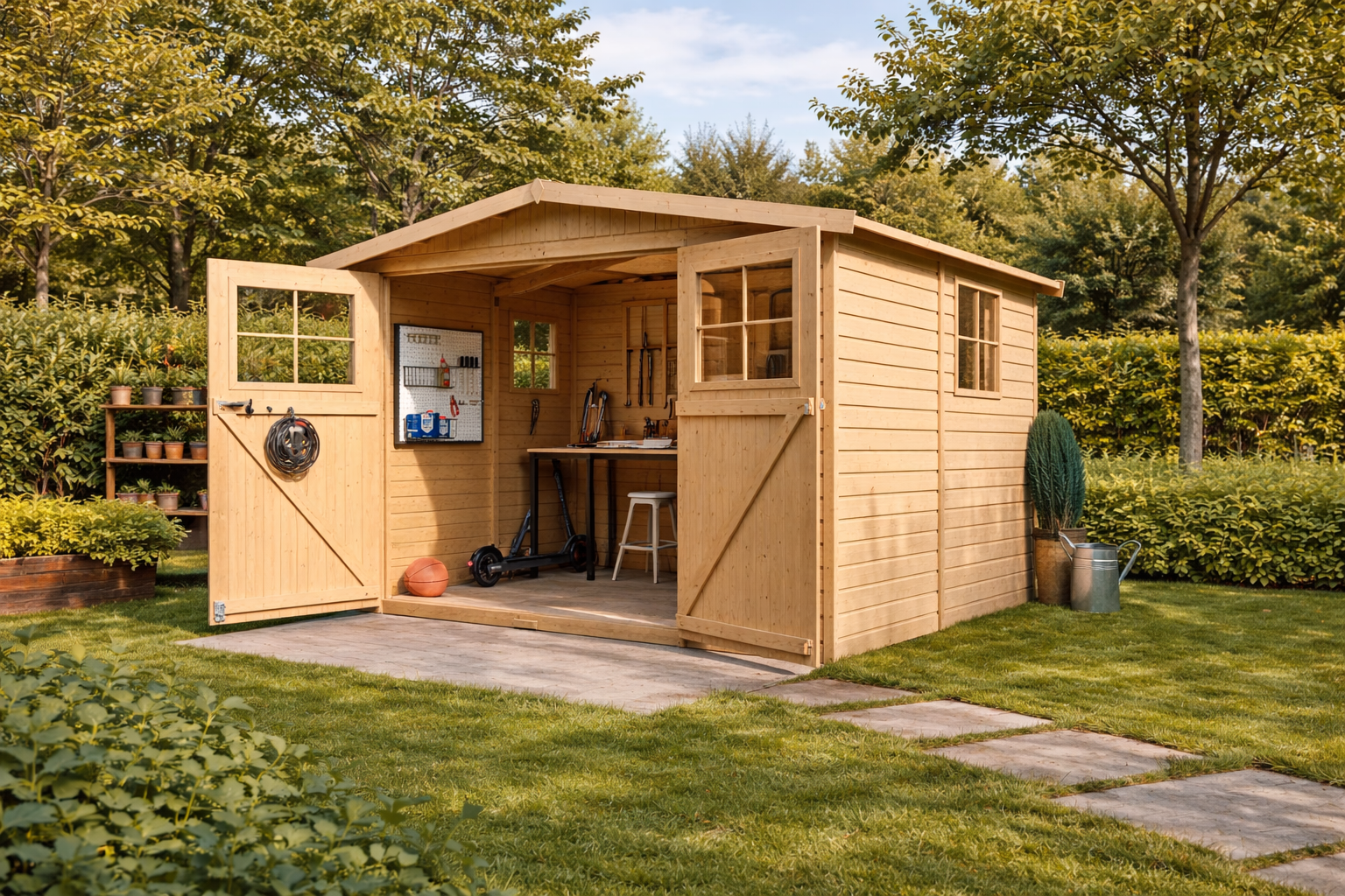 El modelo Grand Classic (TBL-8) redefine lo que un cobertizo de jardín puede ofrecer. Gracias a su generosa anchura de más de 3 metros, permite una organización interna superior, con espacio suficiente para estanterías perimetrales y almacenamiento central de objetos voluminosos.