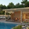 Estancias Independientes: Gracias a sus paredes interiores de entramado y paneles OSB de 22 mm por ambas caras, la Ribera Plus permite crear zonas separadas para una sauna privada, un cuarto de baño o un despacho independiente.