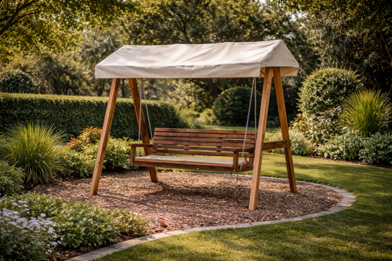 El columpio MB-2 ha sido diseñado para ser el protagonista de tu zona de descanso. Su estructura en «A» sobredimensionada no solo aporta una estabilidad excepcional, sino que sirve de soporte para un tejado textil que protege tanto a los usuarios como a la propia madera del banco. Es la solución perfecta para jardines despejados donde se requiere un punto de sombra artificial con un acabado estético superior a las estructuras metálicas.