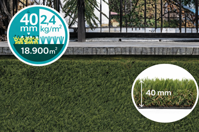 Pisada Confortable: Con 40 mm de altura, ofrece una superficie mullida y agradable, ideal para zonas de descanso, jardines residenciales y perímetros de piscinas.
