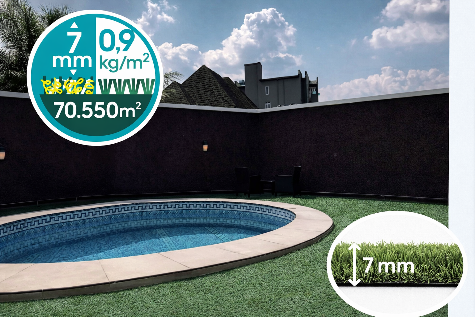 Simplicidad y funcionalidad en un solo producto. El Green Lubeck 7 es el césped tipo moqueta de 7 mm ideal para quienes buscan una solución rápida, estética y muy económica. Es la opción preferida para proteger la base de piscinas desmontables, cubrir grandes superficies en ferias o dar un aspecto limpio y renovado a terrazas con un mantenimiento nulo.
