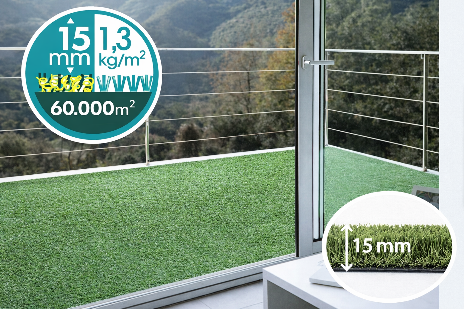 Evolución del Césped Moqueta: A diferencia de los modelos básicos de 6 u 8 mm, sus 15 mm de altura ofrecen un volumen real que mejora la estética del espacio y la sensación al caminar.
