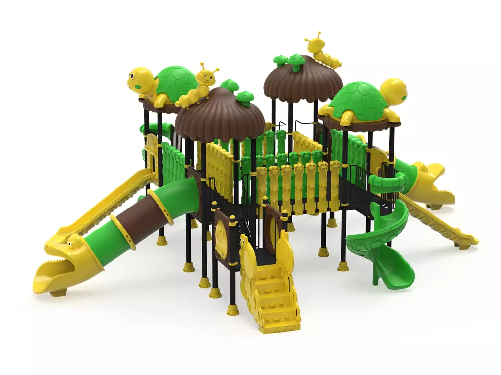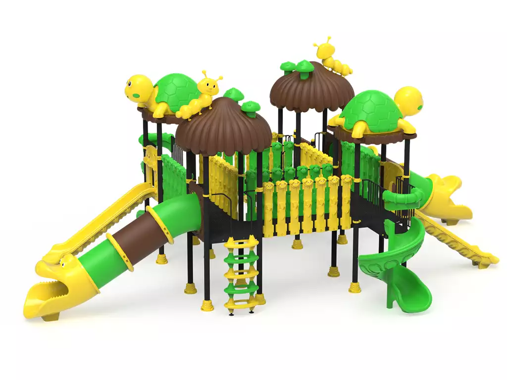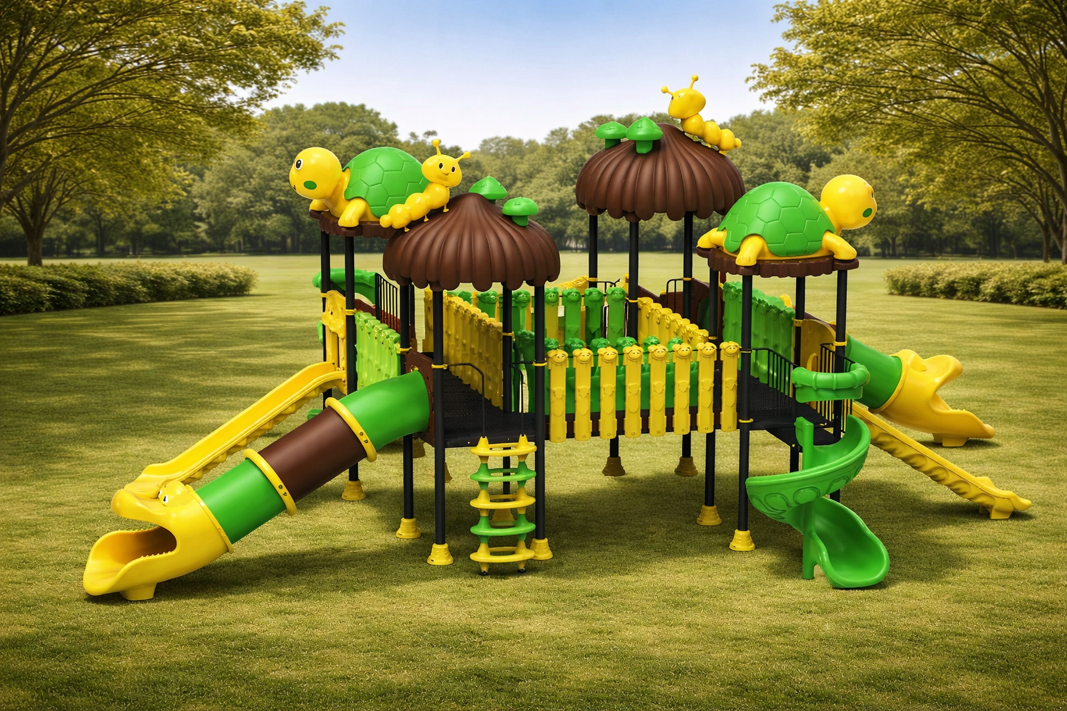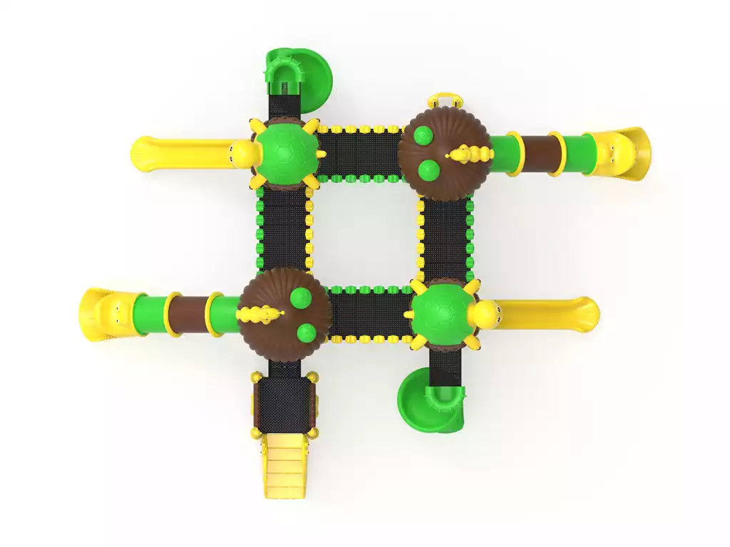 ¡Una expedición gigante al reino de las tortugas! El Modelo PSI-15 es un complejo recreativo profesional de gran formato, diseñado para ofrecer una inmersión total en la naturaleza. Este parque destaca por su innovador diseño de techos protectores en forma de caparazón y hongos, que proporcionan amplias zonas de sombra. Cuenta con una oferta de descenso inigualable: un tobogán en espiral, un túnel tubular cerrado y dos toboganes rectos. Con múltiples accesos que incluyen muros de escalar y rampas, el PSI-15 fomenta la coordinación motriz y el juego social en niños de 3 a 12 años. Fabricado con acero galvanizado y LLDPE rotomoldeado, es la solución definitiva para proyectos que exigen máxima durabilidad y seguridad bajo la normativa europea.