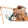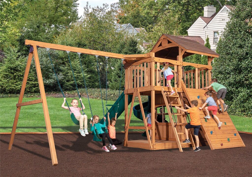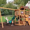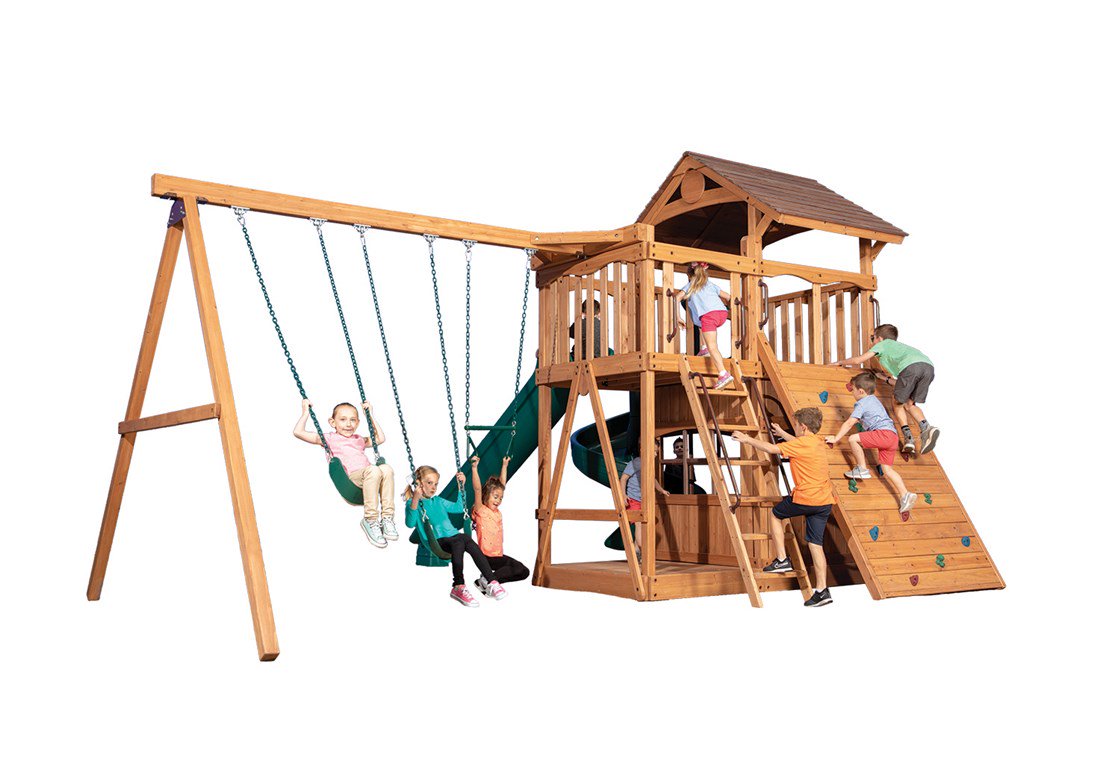 El Olympian Outlook XL 1 ha sido diseñado para familias que no quieren elegir entre un tipo de juego u otro. Este modelo combina la estética de una cabaña de montaña con la funcionalidad de un centro de entrenamiento físico, ofreciendo una de las plataformas más amplias de su categoría para que varios niños jueguen simultáneamente sin estorbarse.