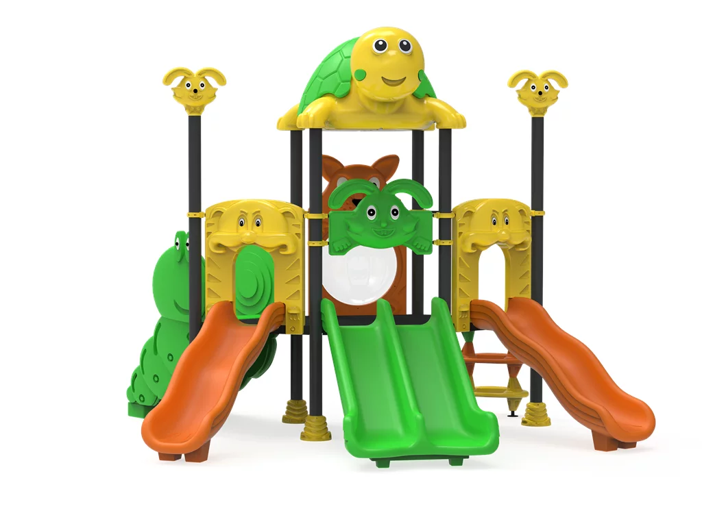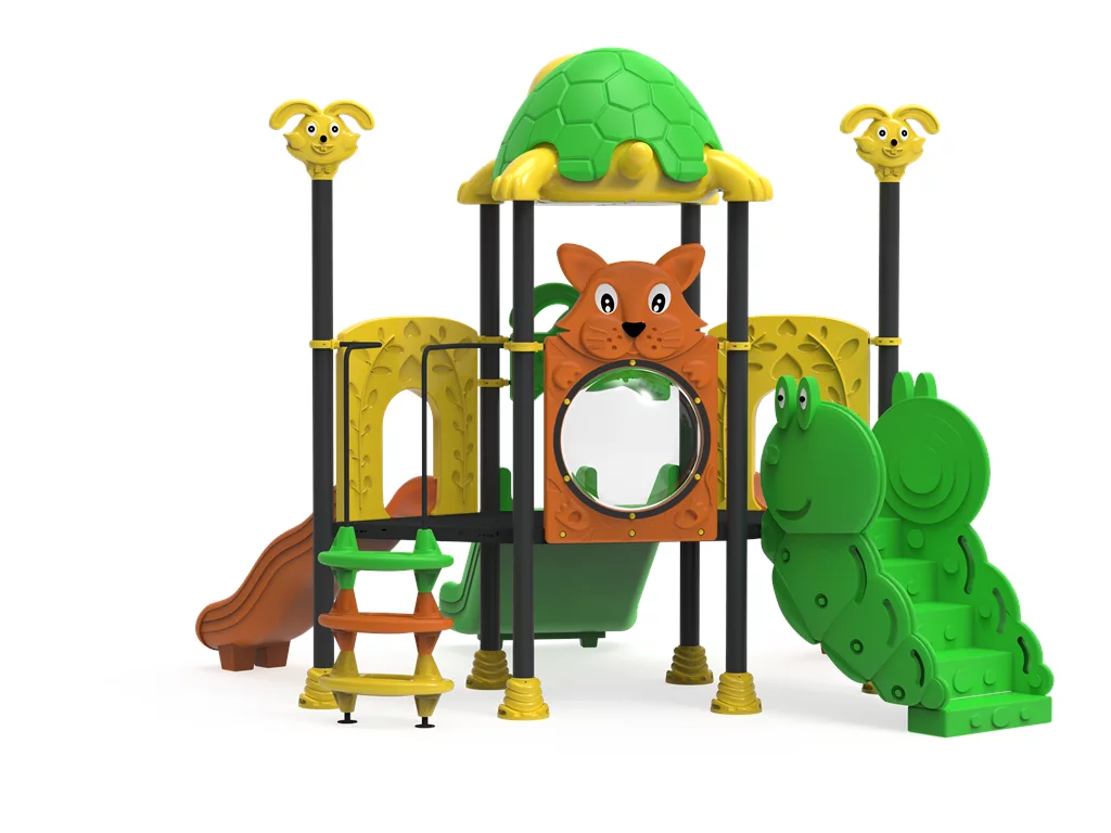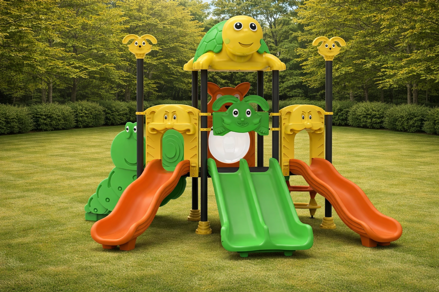 ¡Un mundo de ternura y aventura para los más pequeños! El Modelo PSI-03 es un complejo recreativo diseñado específicamente para fomentar el desarrollo motriz y sensorial en edades tempranas. Con una encantadora temática de tortugas, ranas y gatos, este parque ofrece tres toboganes de diferentes niveles, rampas de acceso seguro y paneles táctiles en relieve. Fabricado con acero galvanizado y polietileno de alta densidad (LLDPE), garantiza una resistencia total a la intemperie y al uso intensivo. Es la opción líder para guarderías, colegios y comunidades que buscan máxima seguridad en un formato compacto de 5,2 metros.