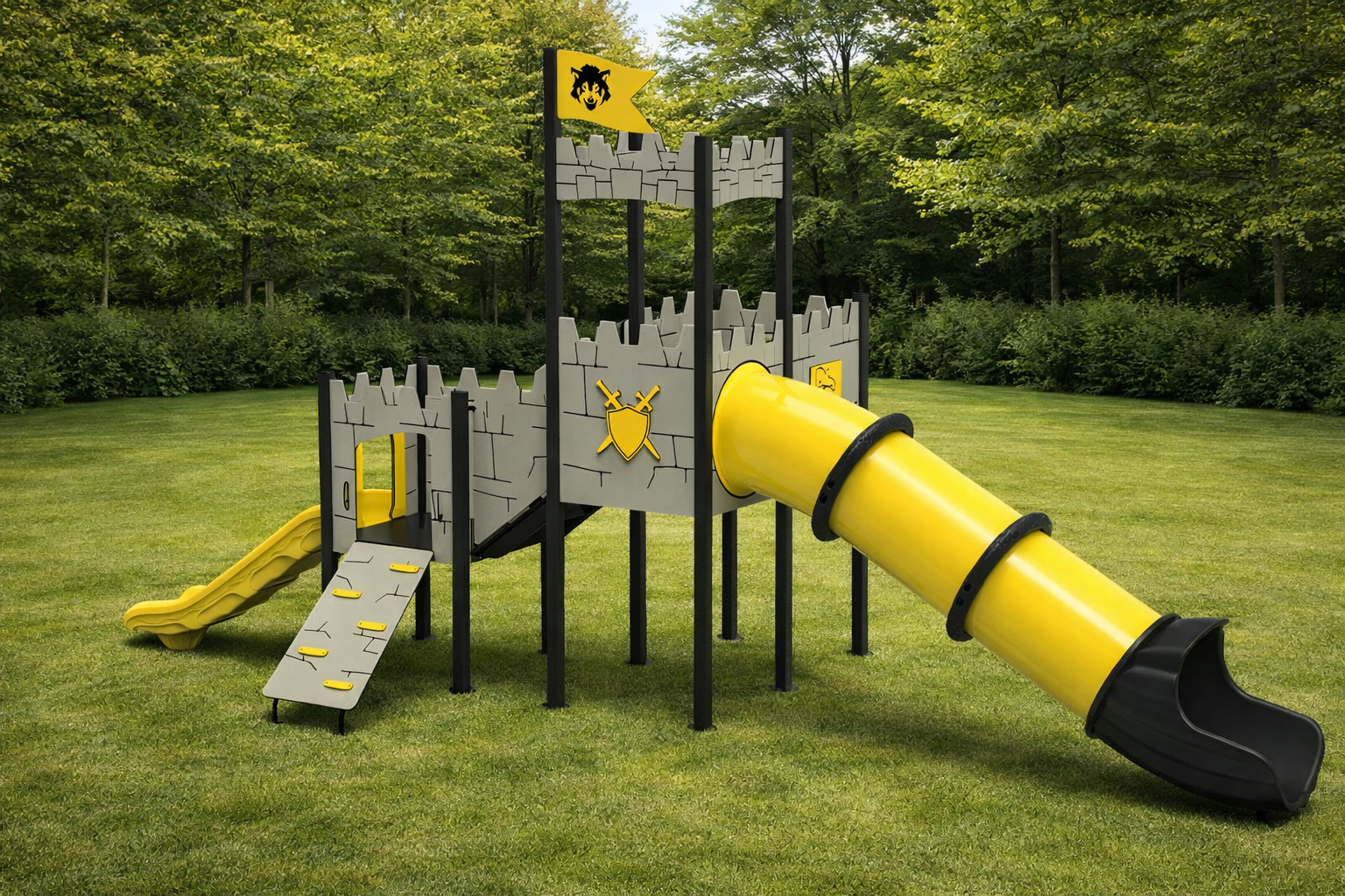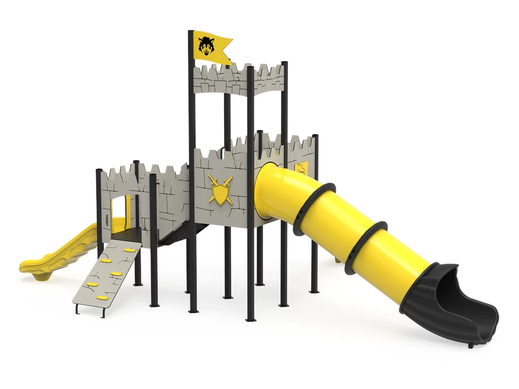 El Modelo PSIN-13 redefine el concepto de áreas recreativas públicas. Diseñado para capturar la imaginación de «caballeros y princesas», este complejo temático ofrece un circuito de retos físicos y sensoriales en una estructura de 8,5 metros de largo. Su combinación de colores amarillo y gris aporta un aspecto moderno y vibrante, mientras que sus materiales de grado industrial aseguran una vida útil prolongada con el mínimo mantenimiento.