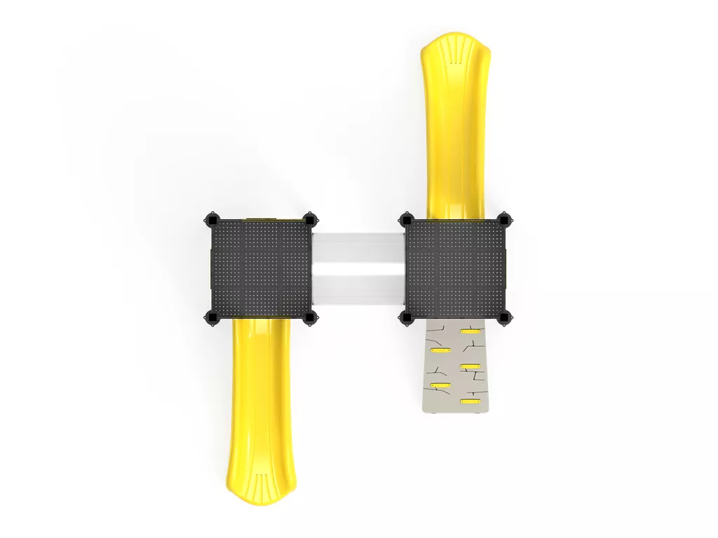 Doble Tobogán Amarillo: Dos rampas paralelas de polietileno rotomoldeado que permiten descensos rápidos, estables y seguros. Su color vibrante resiste la decoloración solar.