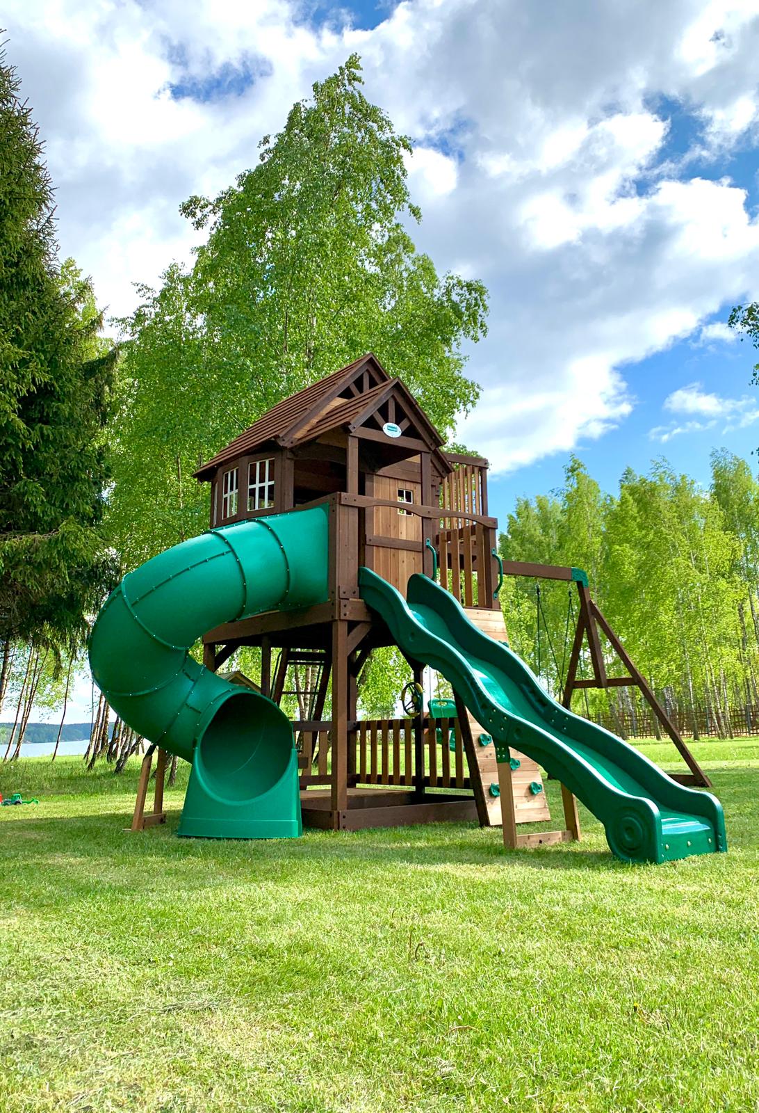 El centro de juegos definitivo para familias grandes y pequeños exploradores. Este parque de 100% madera de cedro ofrece una experiencia de 360 grados: desde la emoción de su tobogán tubular en espiral y el columpio de disco tipo telaraña, hasta la calma de su casa club elevada con mirador Crow’s Nest. Con capacidad para 15 niños, incluye una zona de picnic y arenero sombreado, garantizando horas de diversión segura y creativa bajo los estándares ASTM.