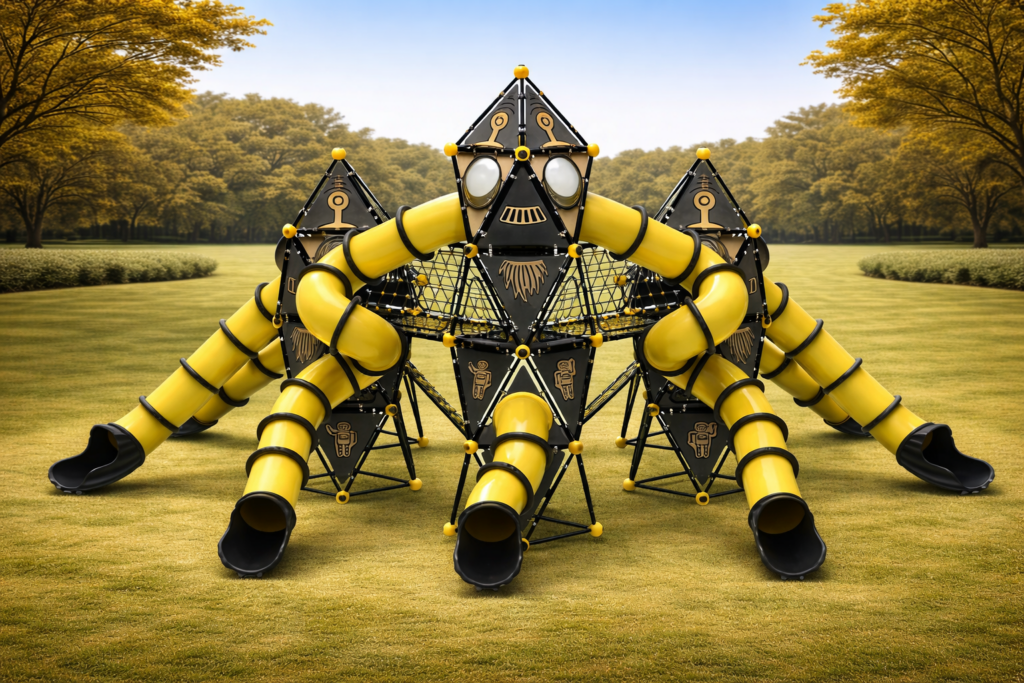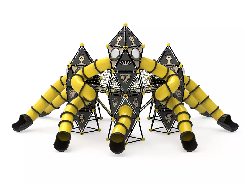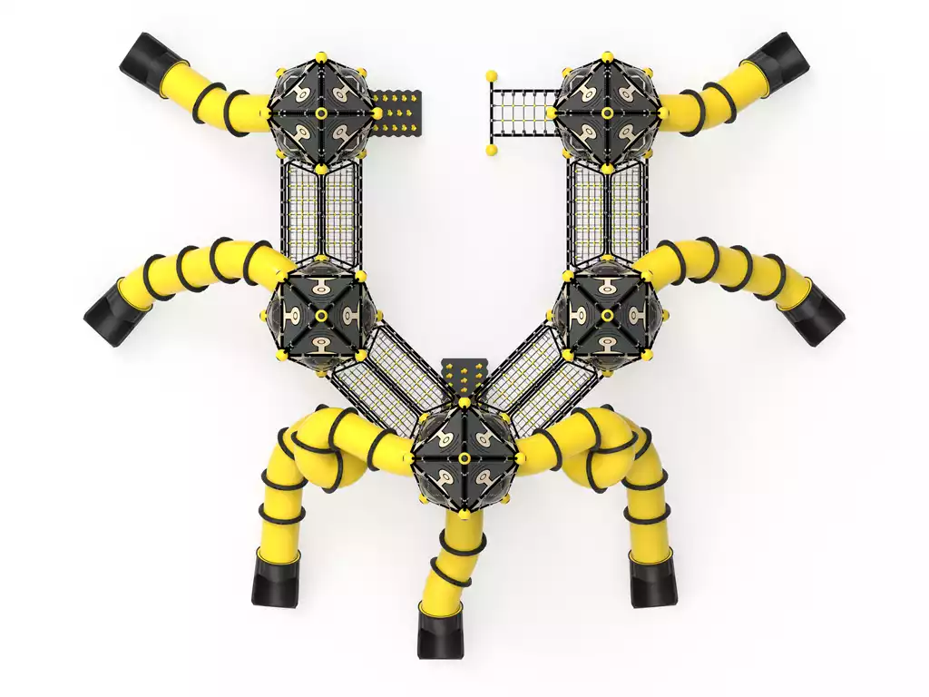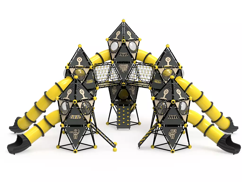 ¡Un salto gigante para la diversión! El Modelo PSIN-02 es un complejo recreativo modular de alto impacto visual, diseñado bajo una estética futurista en negro y amarillo. Este parque destaca por sus torres geométricas interconectadas mediante túneles y pasarelas que emulan una estación espacial. Equipado con toboganes tubulares cerrados de alta velocidad y redes de escalada tridimensionales, el PSIN-02 desafía el equilibrio y la fuerza física en un entorno de ciencia ficción. Fabricado con acero galvanizado y paneles de HDPE de 19 mm, es la estructura más resistente del mercado contra el vandalismo y el clima extremo. Ideal para proyectos urbanos que buscan modernidad, capacidad masiva y una durabilidad excepcional.
