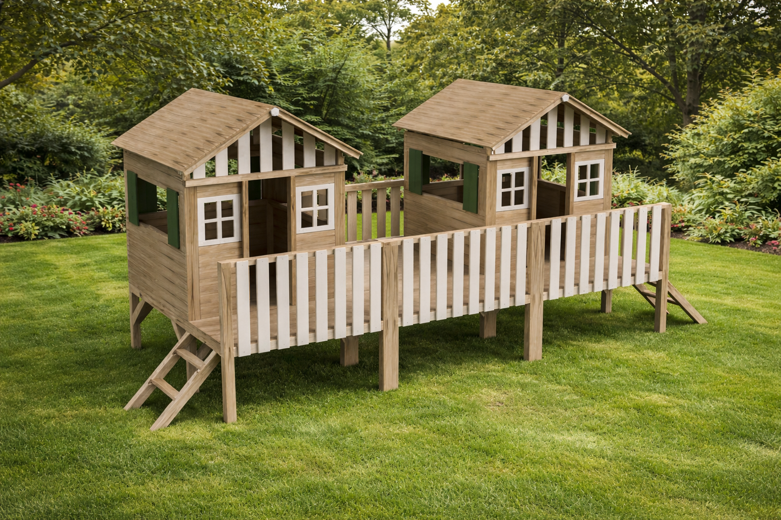 ¡Naturaleza y aventura en un diseño de alto rendimiento! El Modelo MSP-3 es una estructura de juego doble fabricada en madera de pino nórdico maciza, tratada en autoclave Clase IV para resistir las condiciones climáticas más exigentes sin perder su estabilidad. Este complejo destaca por sus dos torres interconectadas por un puente elevado, creando un circuito de movimiento que fomenta la socialización y la motricidad. Con ventanas decorativas y barandillas de seguridad integradas, es la solución ideal para ayuntamientos, campings, hoteles y centros educativos que buscan un parque duradero, certificación FSC y homologación para uso público intensivo.