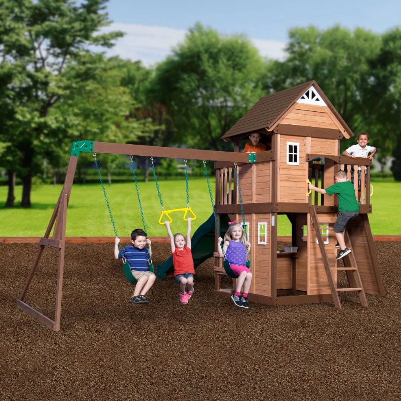 El paraíso de la imaginación para tu jardín. Este robusto parque infantil de 100% madera de cedro no solo ofrece adrenalina con su tobogán de 3 metros y columpios, sino que fomenta el juego de rol con una cocinita completa (fregadero y fogón) y una casa club elevada con vistas panorámicas. Diseñado para la máxima seguridad, permite que hasta 11 niños exploren, cocinen y trepen en un entorno certificado y duradero.