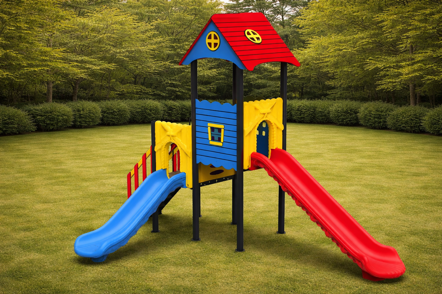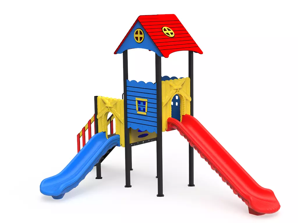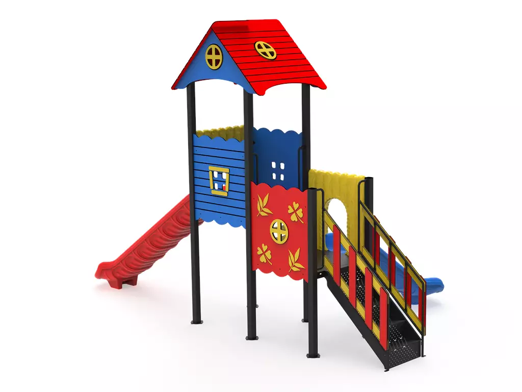 ¡Máxima diversión en el mínimo espacio! El Modelo PSIN-03 es una torre de juego profesional diseñada específicamente para la primera infancia (2 a 8 años). Este complejo combina una encantadora casita elevada con un doble tobogán de colores vibrantes, permitiendo que varios niños compartan la experiencia de descenso simultáneamente. Fabricado bajo los más estrictos estándares europeos con acero galvanizado y paneles de polietileno (LLDPE), es la inversión ideal para guarderías, residenciales y áreas de recreo que buscan durabilidad extrema y seguridad certificada en un diseño que se adapta a cualquier rincón.