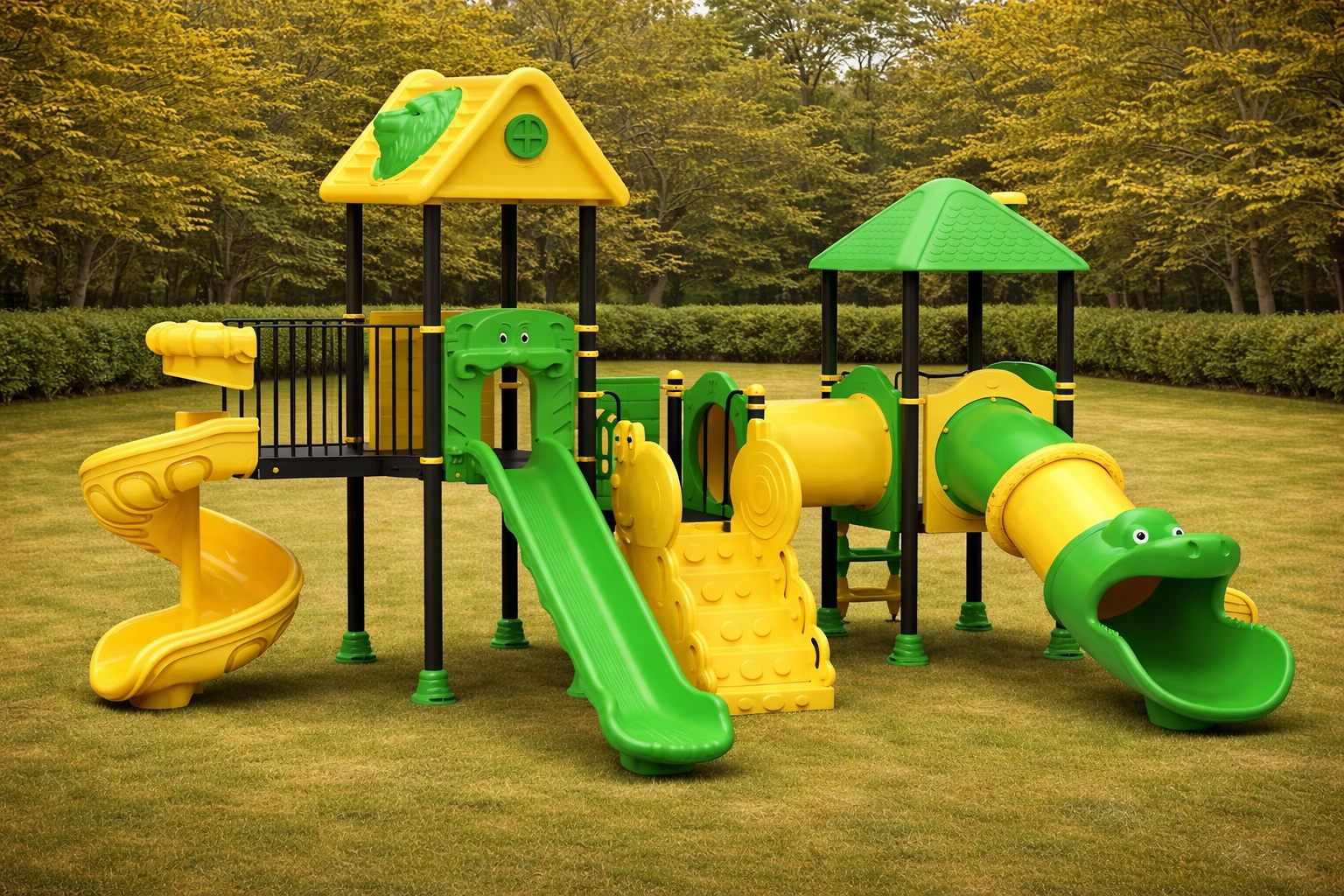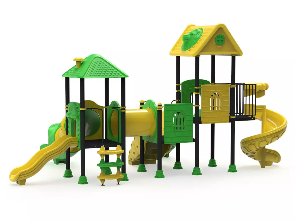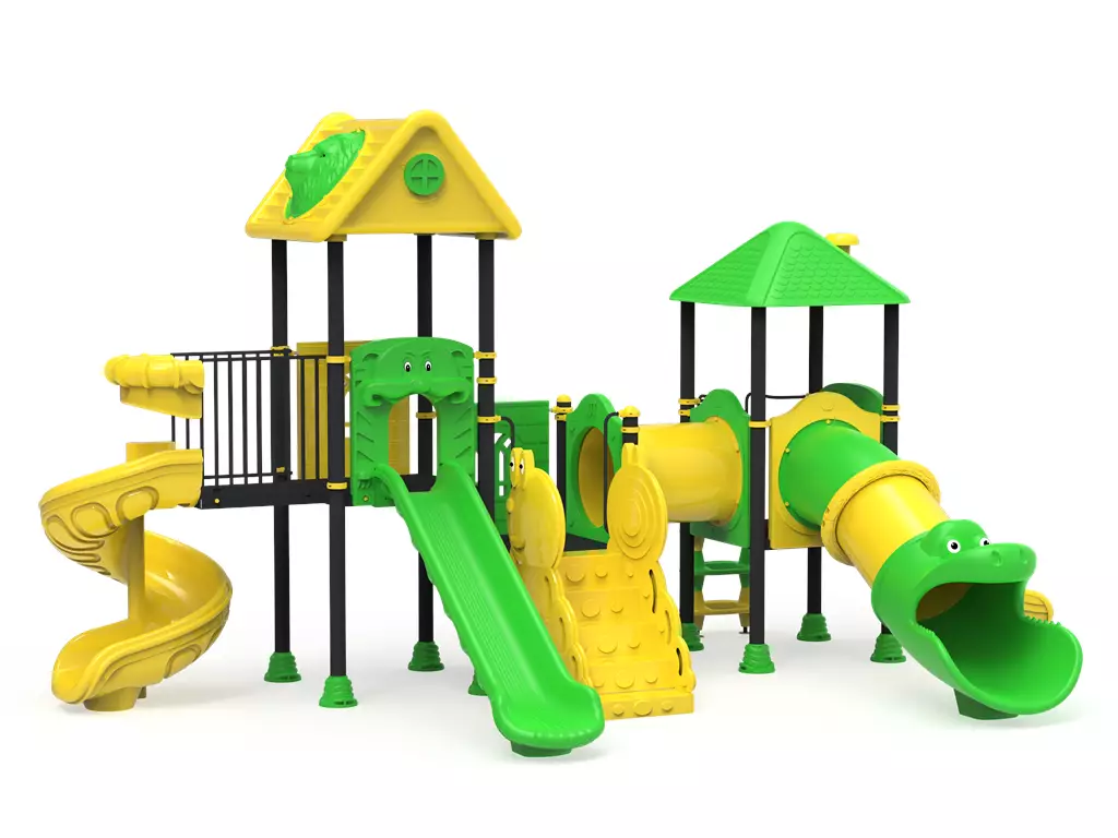 Más allá de la diversión, el Parque Selva PSI-08 funciona como una herramienta pedagógica al aire libre. Los muros de escalar y los túneles interconectados obligan a los niños a planificar sus movimientos, mejorando su orientación espacial, equilibrio y coordinación motora gruesa, mientras que la temática de animales (cocodrilos y hojas) estimula el juego simbólico y la creatividad.