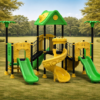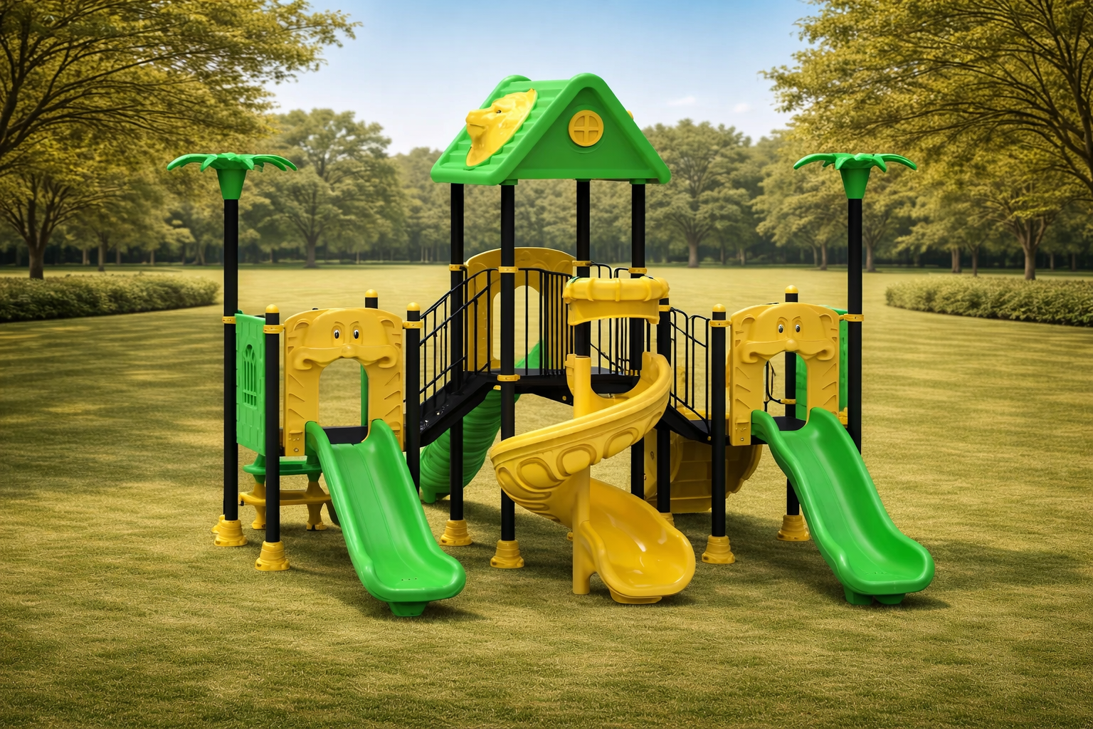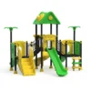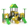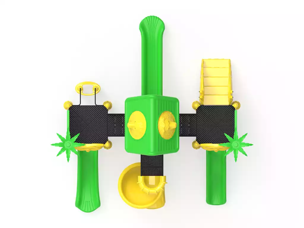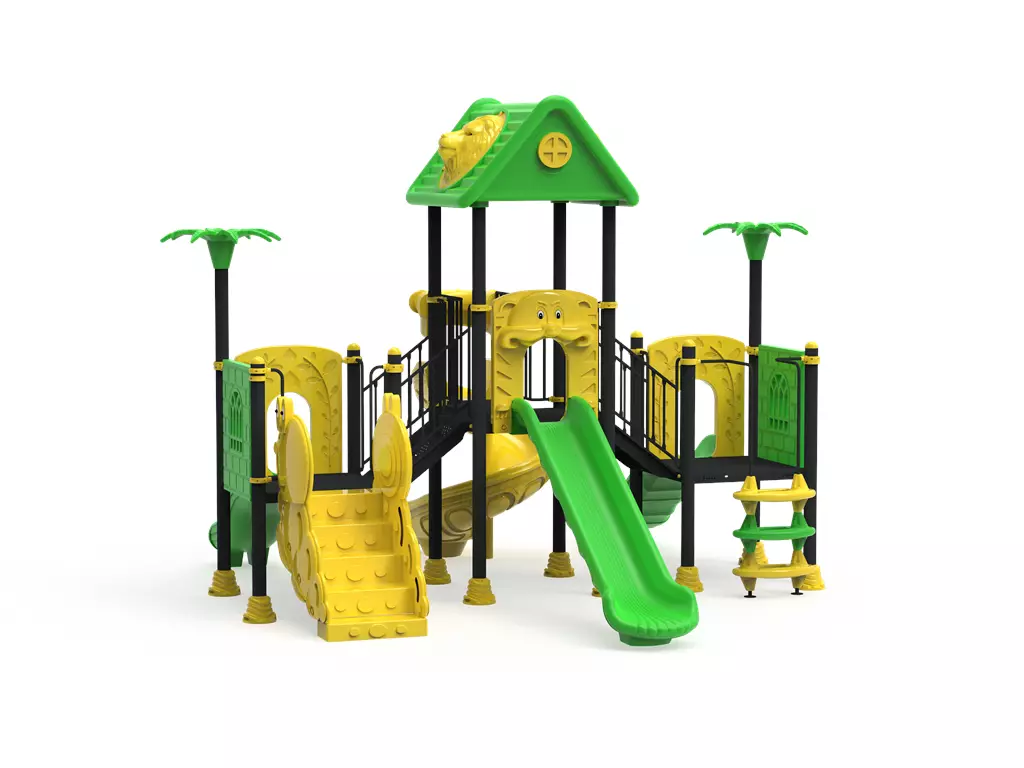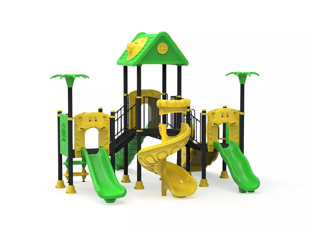 Polietileno de Alta Densidad (HDPE y LLDPE): Los toboganes y paneles temáticos de hojas están fabricados mediante rotomoldeo. Este material es resistente a impactos, no se astilla y mantiene sus colores verde y amarillo vibrantes gracias a sus potentes filtros UV.