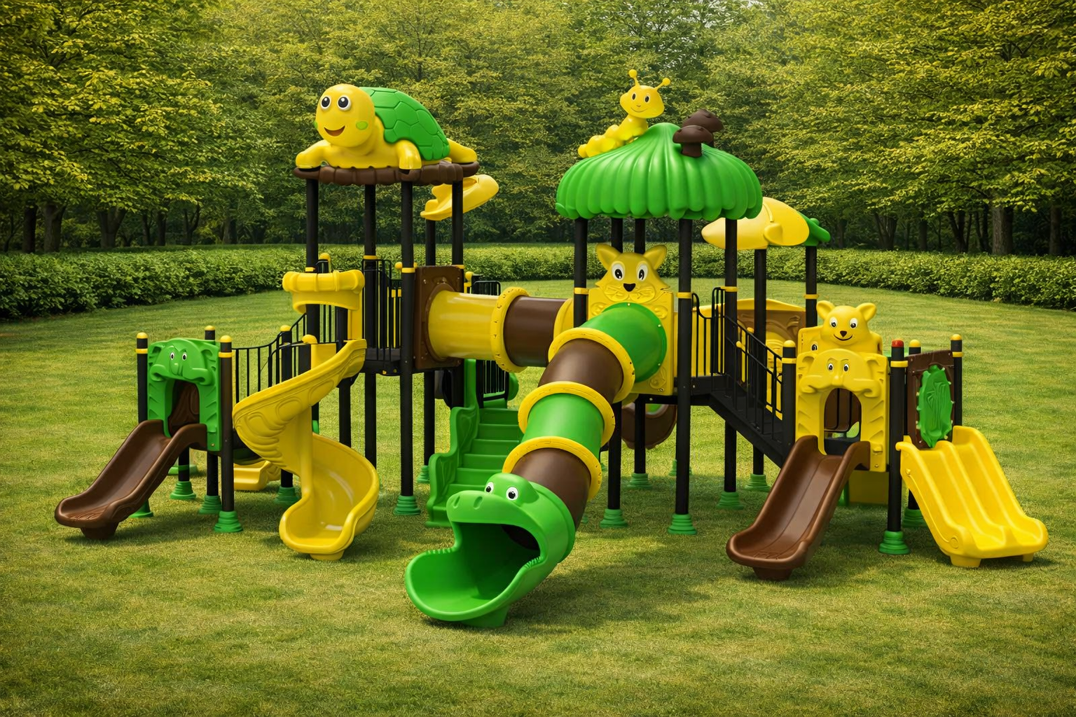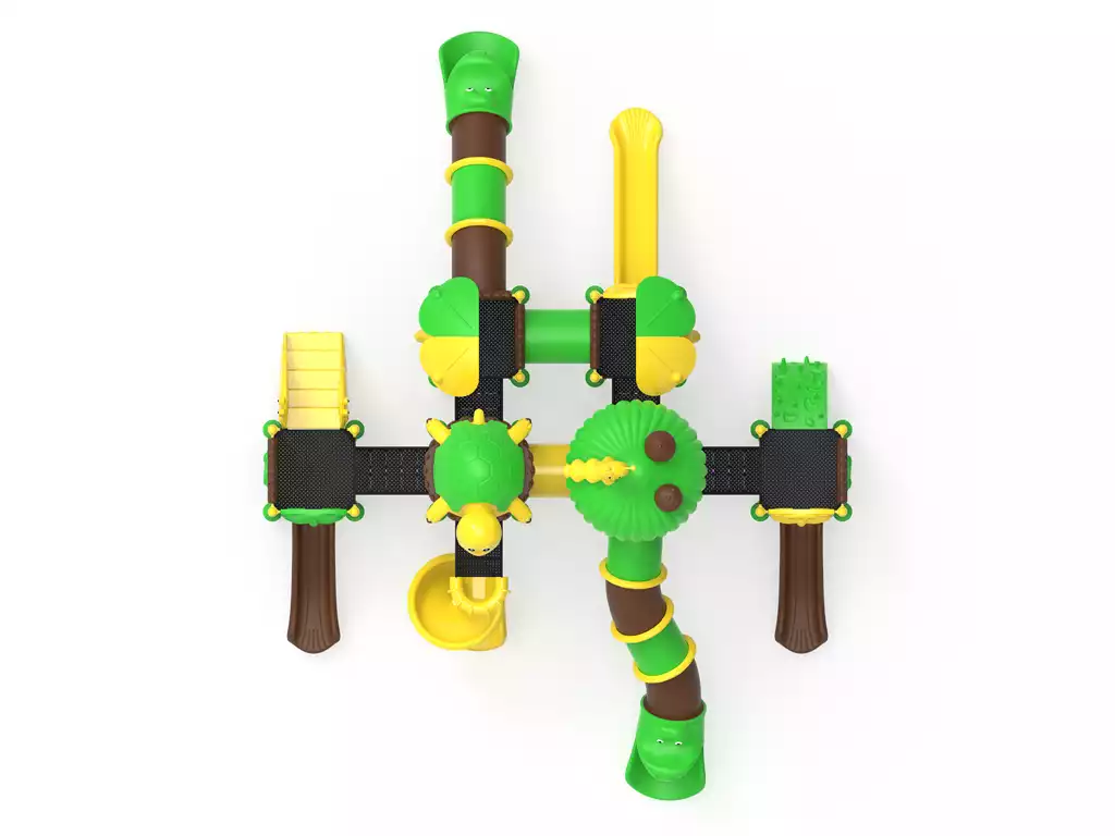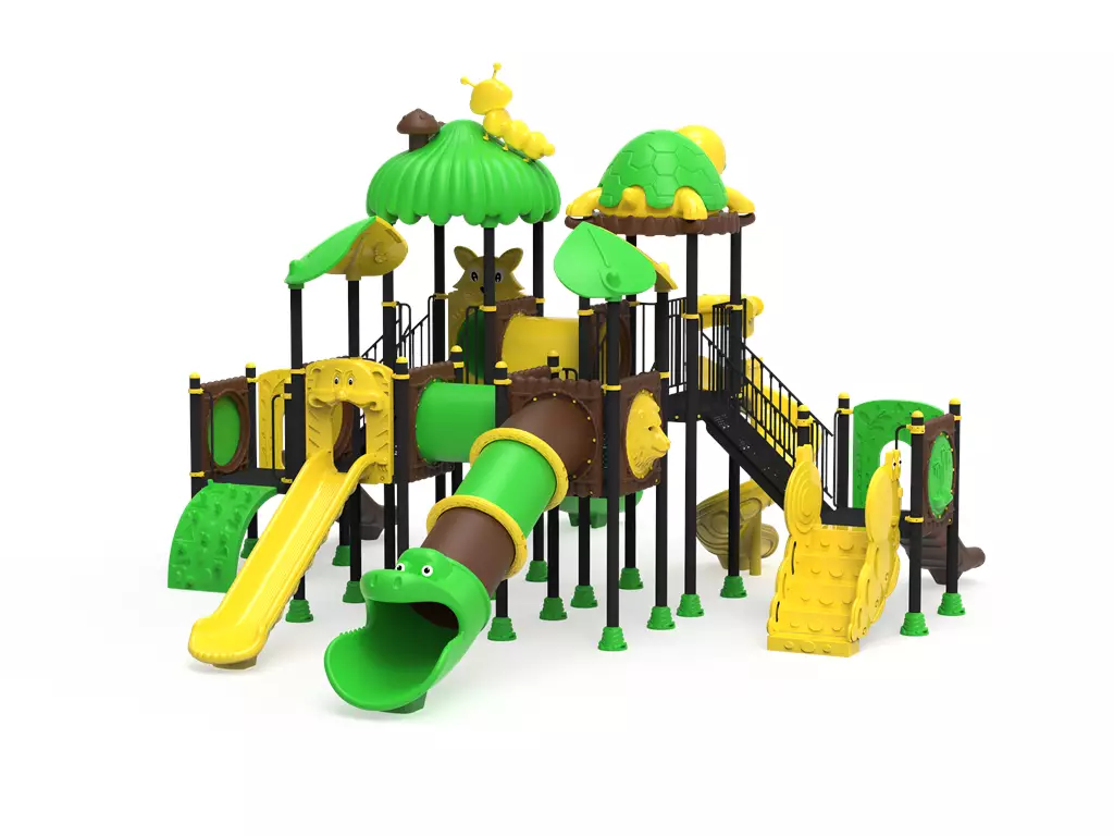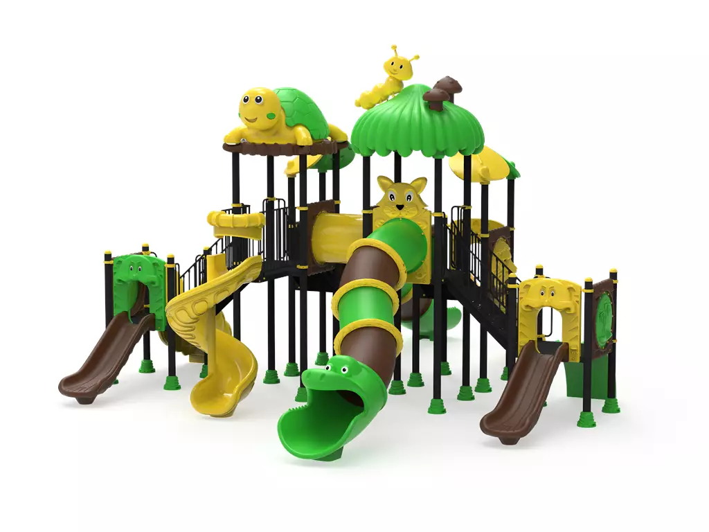 ¡La jungla cobra vida en una aventura de niveles múltiples! El Modelo PSI-14 es un complejo recreativo profesional diseñado para ser el centro de atención en parques y colegios. Esta imponente estructura de 10.5 metros conecta diversas plataformas mediante puentes y túneles, ofreciendo cuatro vías de descenso: toboganes rectos, curvos y un espectacular tubo cerrado tipo serpiente. Con detalles de hongos, hojas y animales del bosque, el PSI-14 fomenta la coordinación y el juego social en niños de 3 a 12 años. Fabricado con acero galvanizado y polietileno rotomoldeado (LLDPE) de alta resistencia, garantiza una durabilidad extrema frente al clima y el uso intensivo bajo la normativa europea de seguridad.