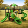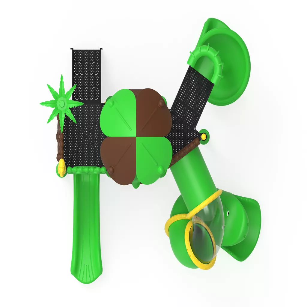 Polímeros LLDPE y HDPE de Alto Grado: Los toboganes, túneles y techos tipo hoja son de polietileno de alta densidad fabricado mediante rotomoldeo. Este material es resistente a impactos, no se astilla y mantiene su color vibrante gracias a sus potentes filtros UV.