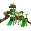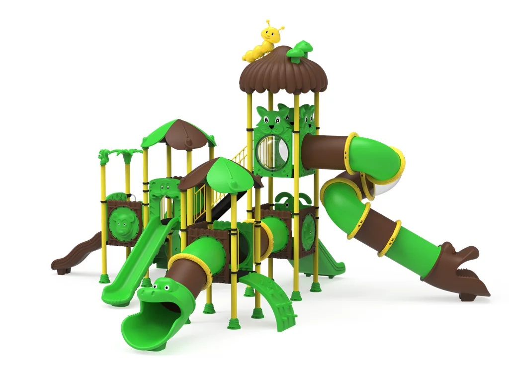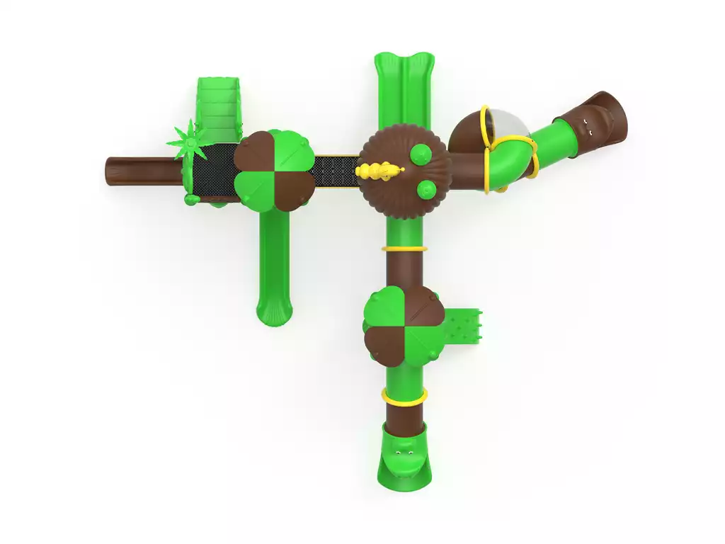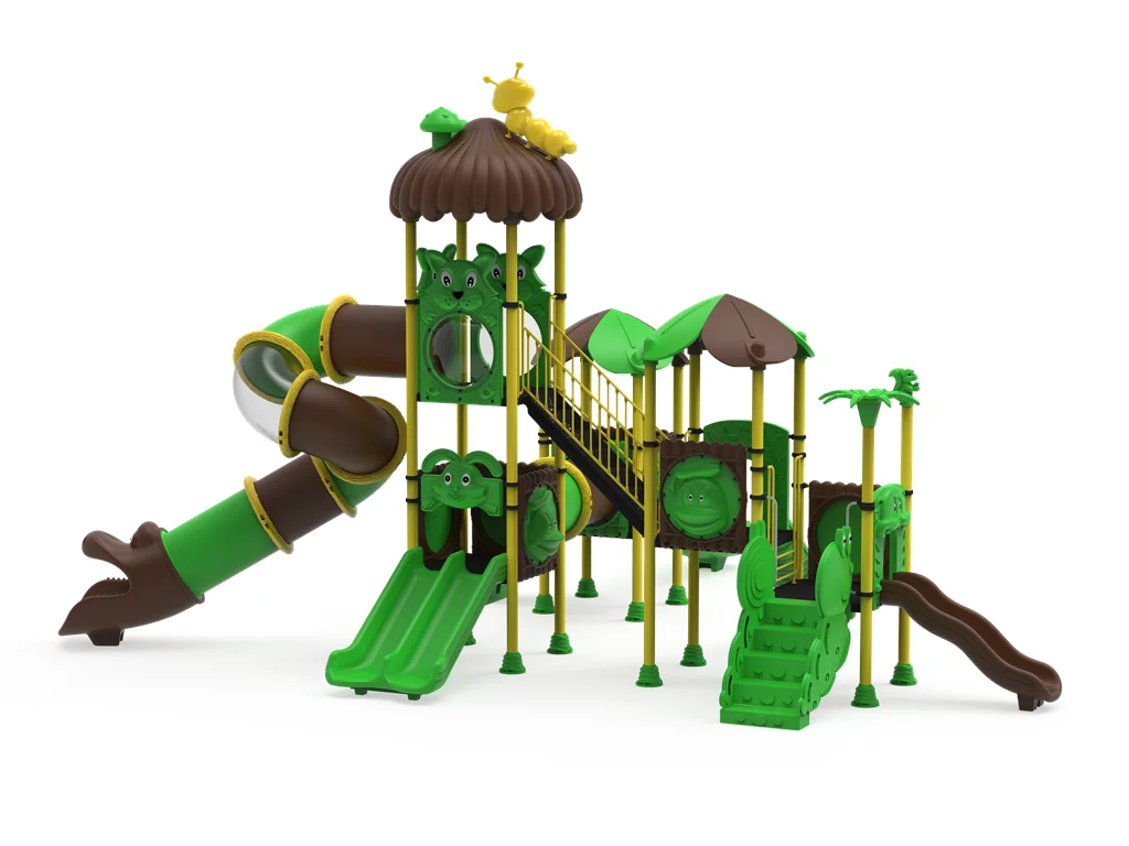 Componentes en LLDPE y HDPE: Los toboganes, techos en forma de hoja y paneles decorativos son de polietileno de alta densidad fabricado mediante rotomoldeo. Este material es resistente a los impactos, no se astilla y mantiene sus colores vibrantes gracias a sus potentes filtros UV.