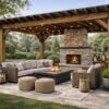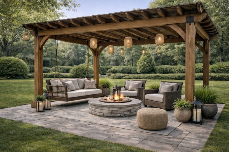 • Diseño Integrado: Como se aprecia en la imagen, nuestras estructuras permiten la instalación fácil de accesorios de lujo: desde sofás columpio suspendidos hasta sistemas de iluminación decorativa con lámparas de fibras naturales.