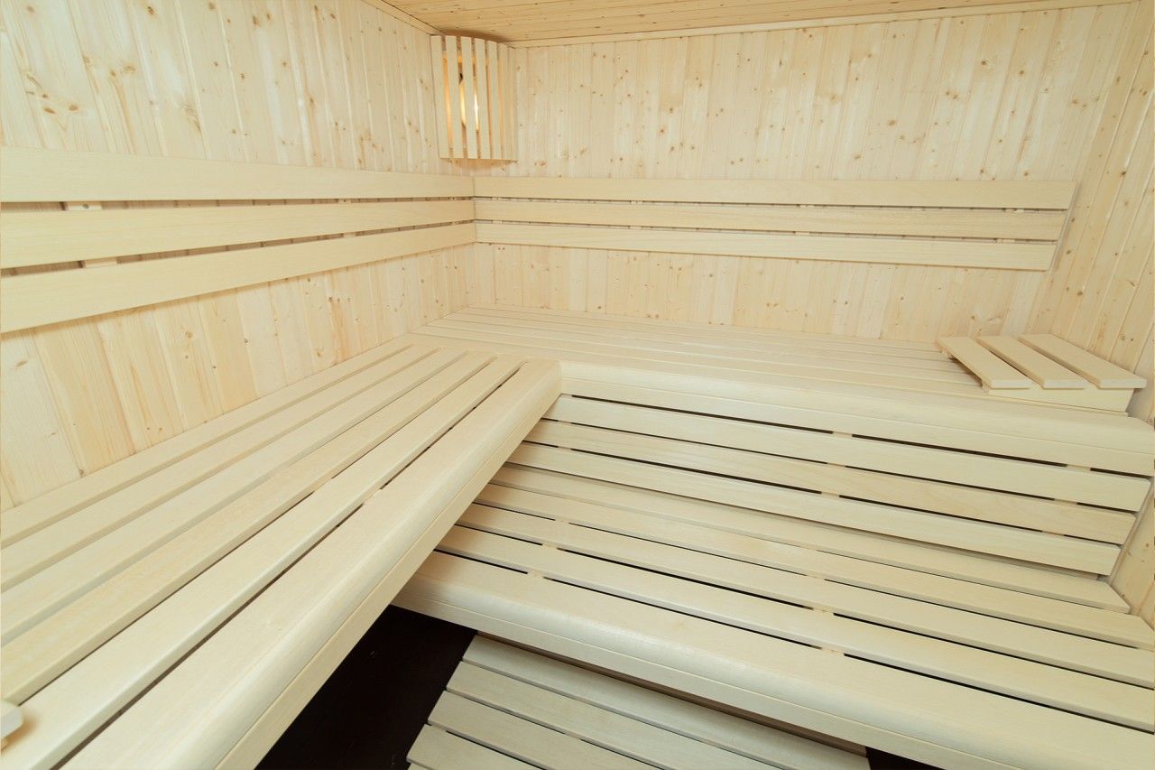 Ergonomía en Madera Blanda: El interior para 3 personas utiliza maderas de baja conductividad térmica. Incluye bancos con nivel inferior ajustable, respaldos ergonómicos y un panel intermedio decorativo que oculta la estructura inferior de los bancos para una estética más limpia.