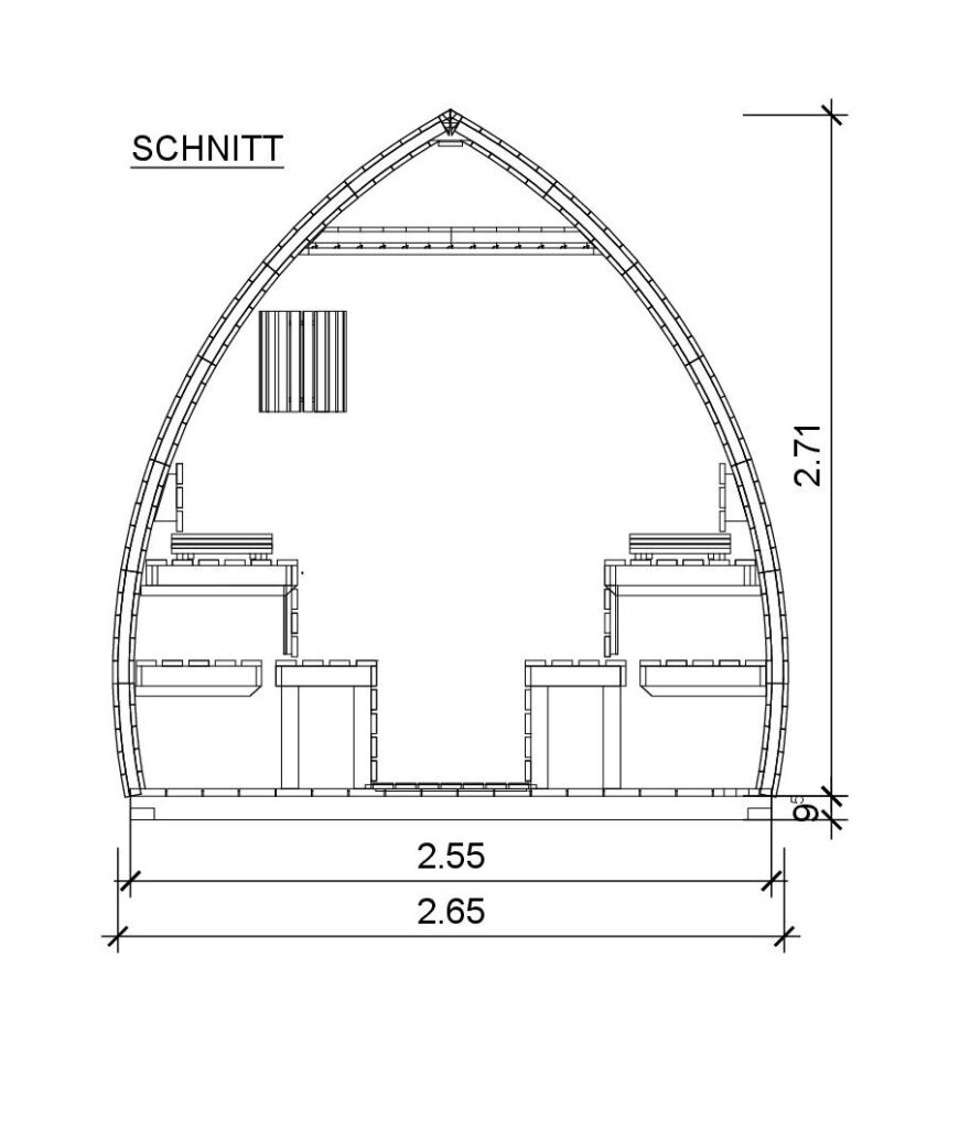 Para evitar puentes térmicos, la Laponia incorpora un bastidor base impregnado de 9,5 cm de altura con tablas cepilladas de 20 mm, protegiendo la sauna de la humedad del suelo. El techo, de 77 mm, repite el esquema de aislamiento de lana de roca y aluminio, asegurando que el calor se distribuya de forma homogénea en toda la cabina.