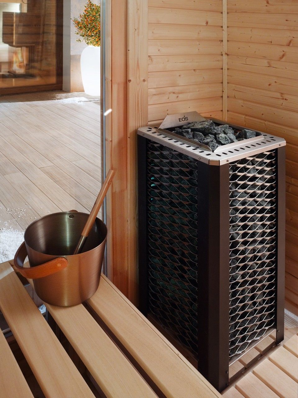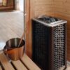 | Caja de accesorios negra: Cubo de sauna con cucharón, reloj de arena e higrómetro. | Oferta especial de 125 € a 99 €. |