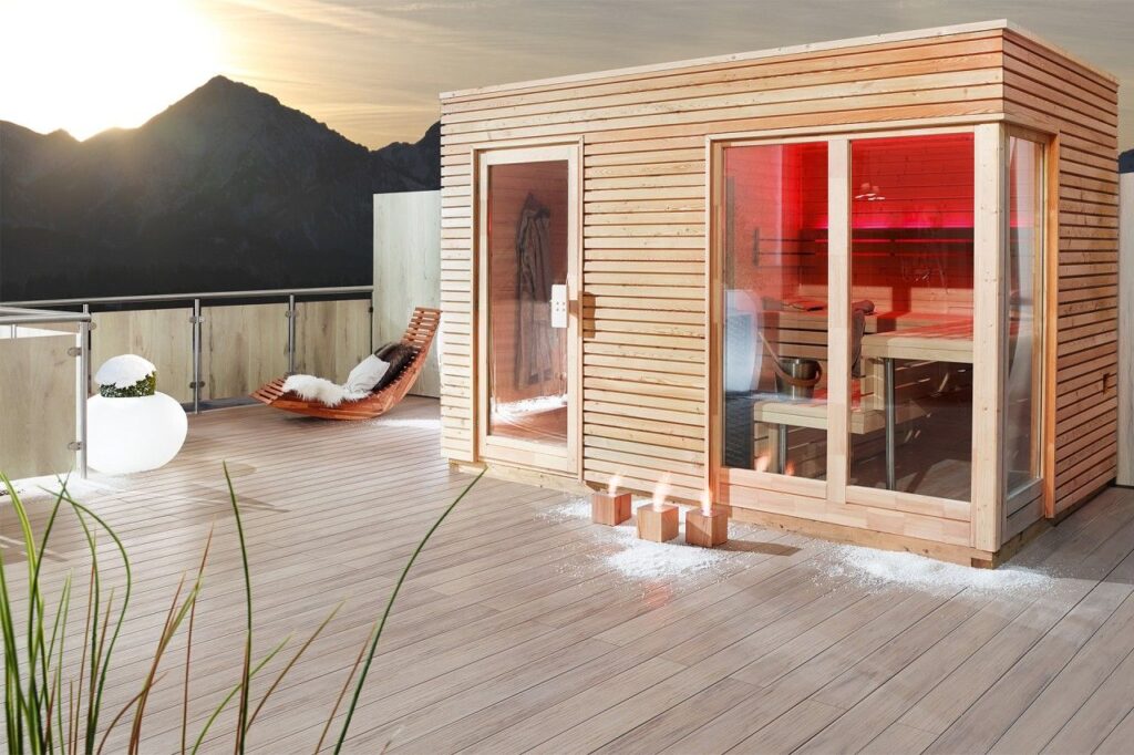SUN Plus, sauna exterior con antesala diseñada para ofrecer confort y funcionalidad en un solo espacio.