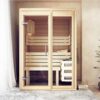 La sauna interior ESPOO Mini demuestra que el verdadero bienestar no requiere de grandes superficies. Diseñada para encajar en rincones estratégicos del hogar, esta sauna combina la robustez del abeto nórdico con un diseño visualmente ligero gracias a su frontal acristalado de altura completa.
