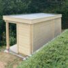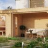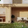 La clave de la FUNNY-5823 reside en su versatilidad constructiva. Puedes elegir entre seis espesores de pared (desde 45 mm hasta 140 mm), todos fabricados con abeto nórdico encolado. El sistema de múltiples juntas machihembradas, reforzado con varillas roscadas empotradas, asegura que la estructura se mantenga compacta y hermética frente a vientos, nieve o calor intenso, ofreciendo una regulación térmica natural que solo la madera auténtica puede brindar.