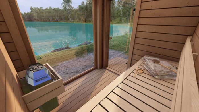 Calefacción Harvia: Equipada con el estándar de oro finlandés (calentador eléctrico de alta precisión), con la posibilidad de actualizar a estufa de leña para una experiencia más rústica y sensorial.