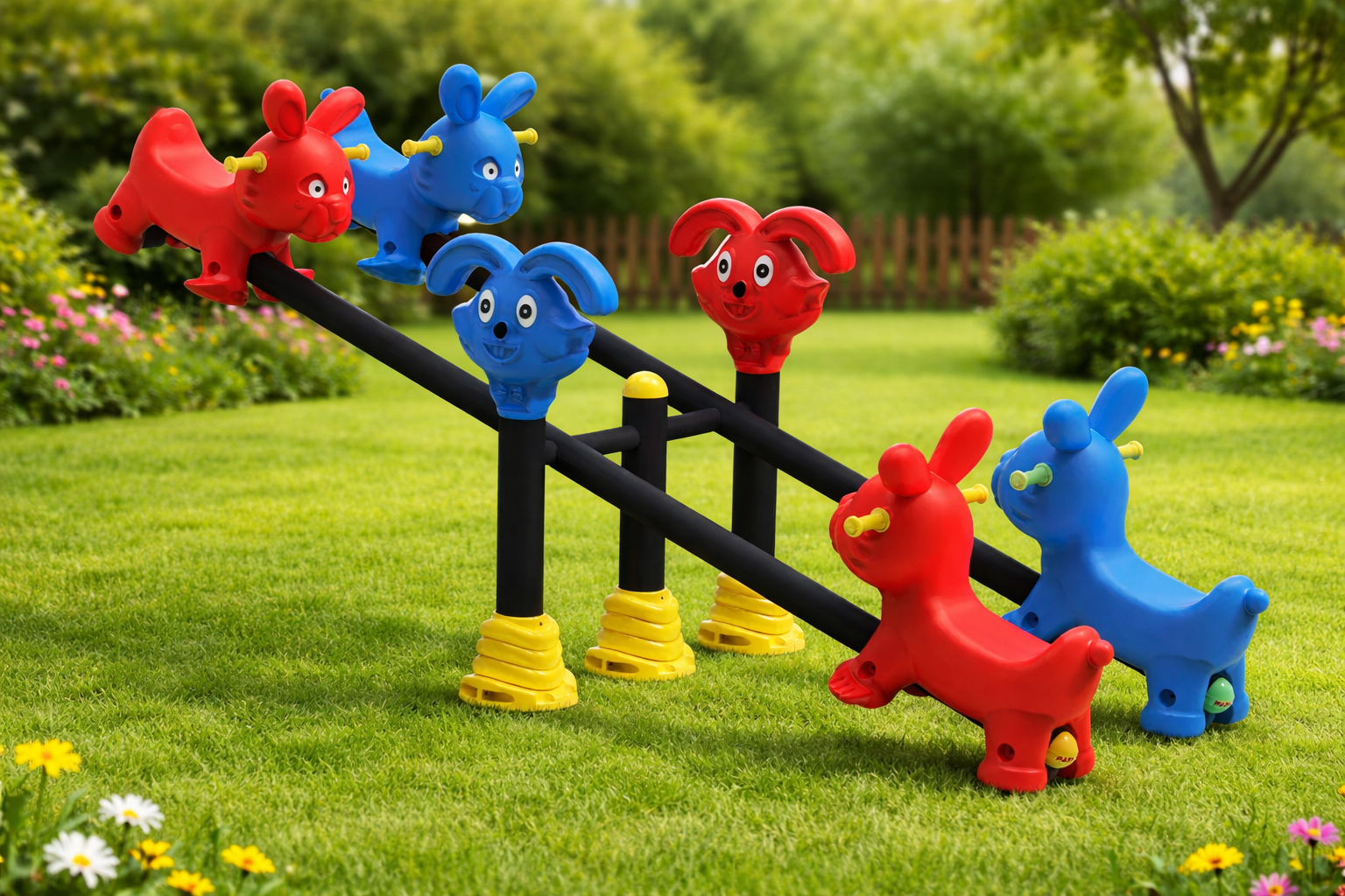 ¡La aventura se multiplica por cuatro! El Modelo PSA-05 es un balancín de gran formato diseñado para el juego grupal y la estimulación temprana. Este robusto conjunto destaca por su configuración de doble asiento por extremo, permitiendo la interacción de cuatro usuarios en un diseño temático con siluetas de animales en colores vibrantes. Gracias a su base reforzada con resortes amortiguadores, el impacto en el descenso se reduce drásticamente, ofreciendo un balanceo suave y seguro. Fabricado con una estructura metálica de pintura electrostática y asientos ergonómicos de polietileno de alta densidad (HDPE), es la solución más resistente y divertida para guarderías, escuelas y áreas recreativas urbanas.