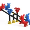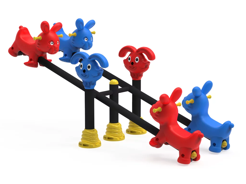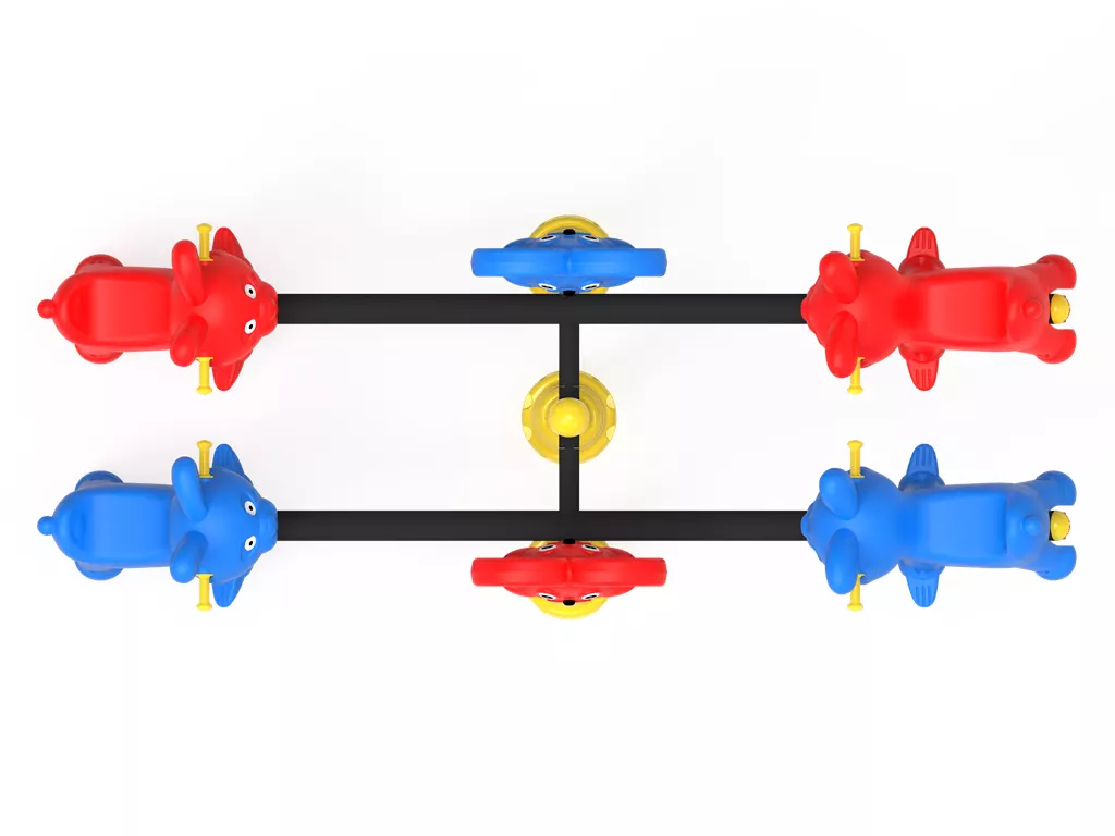 El modelo PSA-05 ha sido proyectado para transformar las áreas infantiles en centros de socialización activa. Al permitir que cuatro niños interactúen en el mismo eje de movimiento, este balancín fomenta el trabajo en equipo, el ritmo coordinado y la empatía. Su diseño con figuras de animales en rojo y azul crea un entorno amigable que atrae visualmente a los más pequeños, facilitando su integración en el juego desde el primer momento.