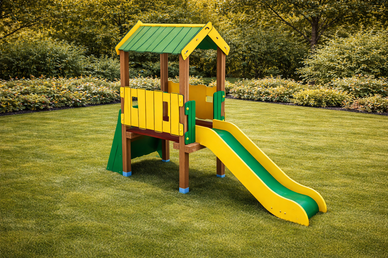 ¡Naturaleza y seguridad para sus primeros descubrimientos! La Torre Baby Nature es un centro de actividades premium diseñado específicamente para la primera infancia. Este modelo destaca por su casita con techo a dos aguas, que ofrece sombra y un espacio acogedor para el juego simbólico, y su tobogán doble de descenso controlado, ideal para que los más pequeños compartan la experiencia de deslizarse con total estabilidad. Fabricada con paneles de HDPE en tonos verdes y amarillos, esta estructura es ultra-resistente, no se astilla y cuenta con bordes redondeados para una protección total. Es la opción predilecta para guarderías, colegios y comunidades que buscan un parque infantil duradero, estético y homologado para uso público intensivo.